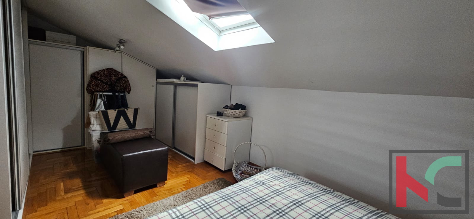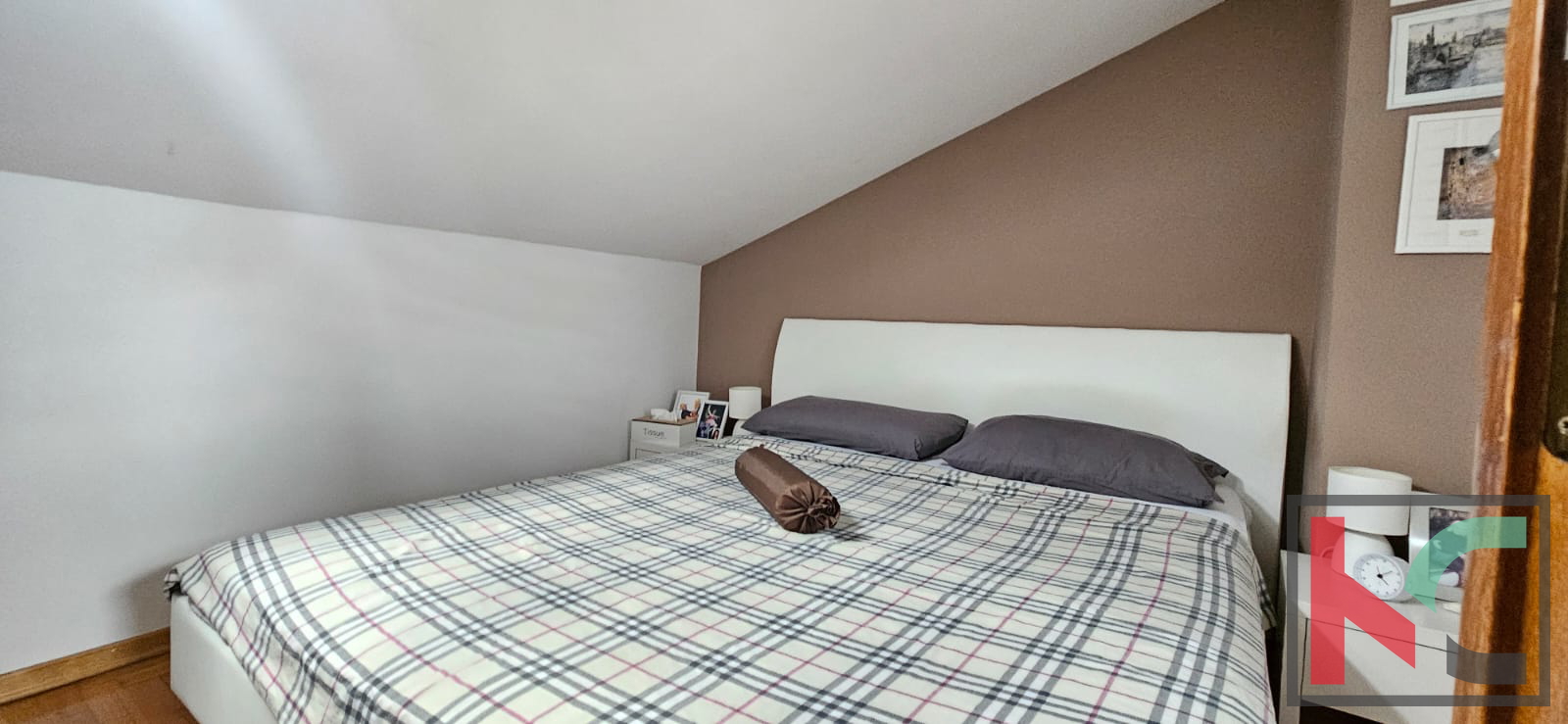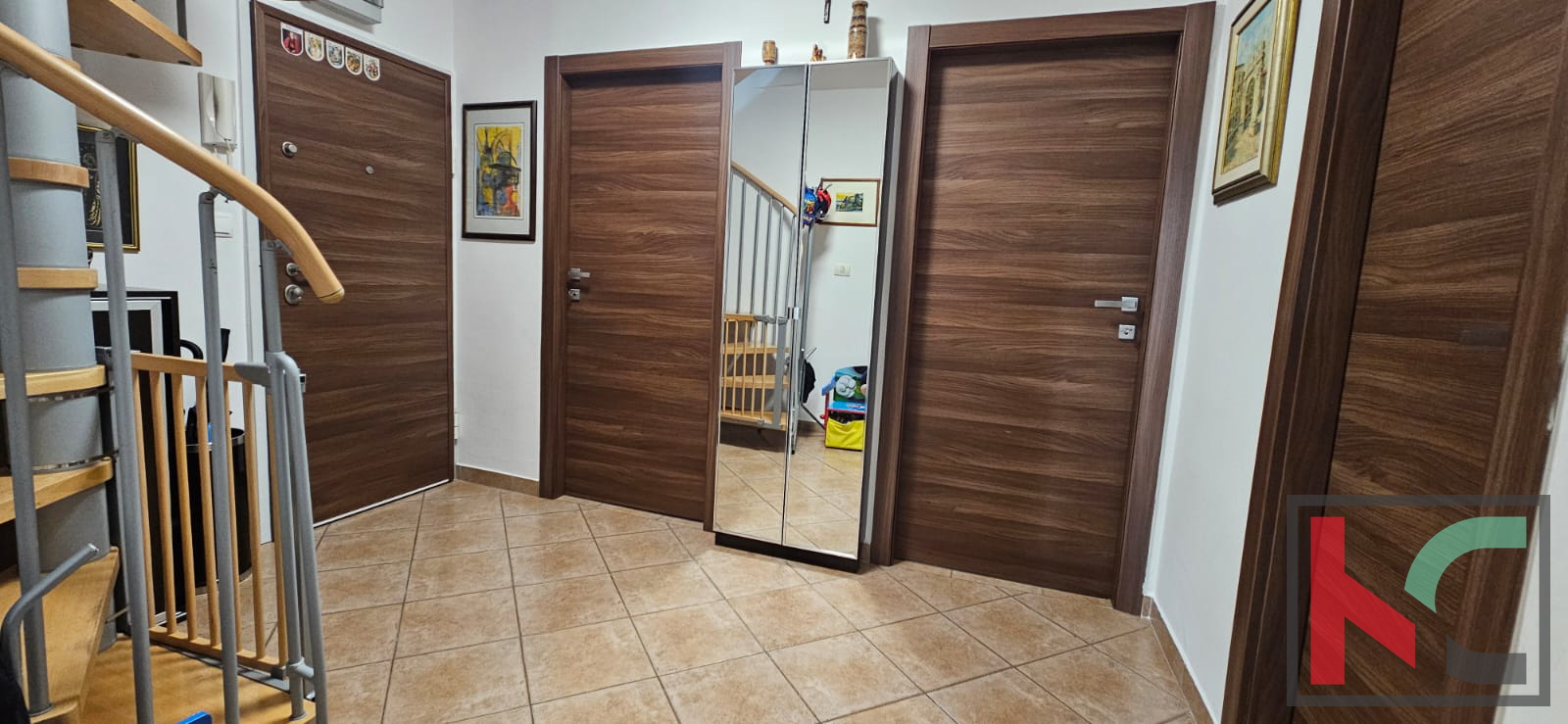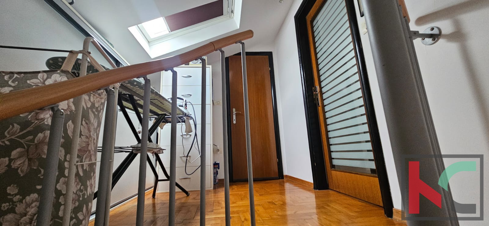 The apartment has a total area of 87m2. On the first level, there is a spacious entrance hall, two large and bright bedrooms, a bathroom with a shower, washing machine, and dryer, a kitchen with a dining area, and a living room with access to a balcony. We go up to the second level where there is an ironing space, one larger bedroom with low built-in wardrobes, and another bathroom. The apartment is located in a quiet area with a beautiful view, close to nature, and in a very sunny position, making it especially comfortable for everyday living.