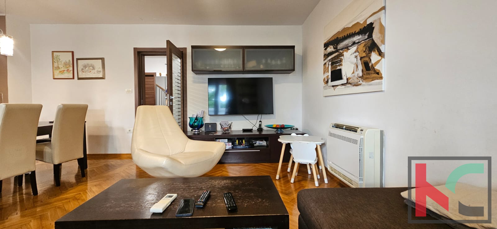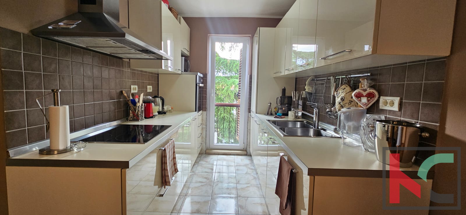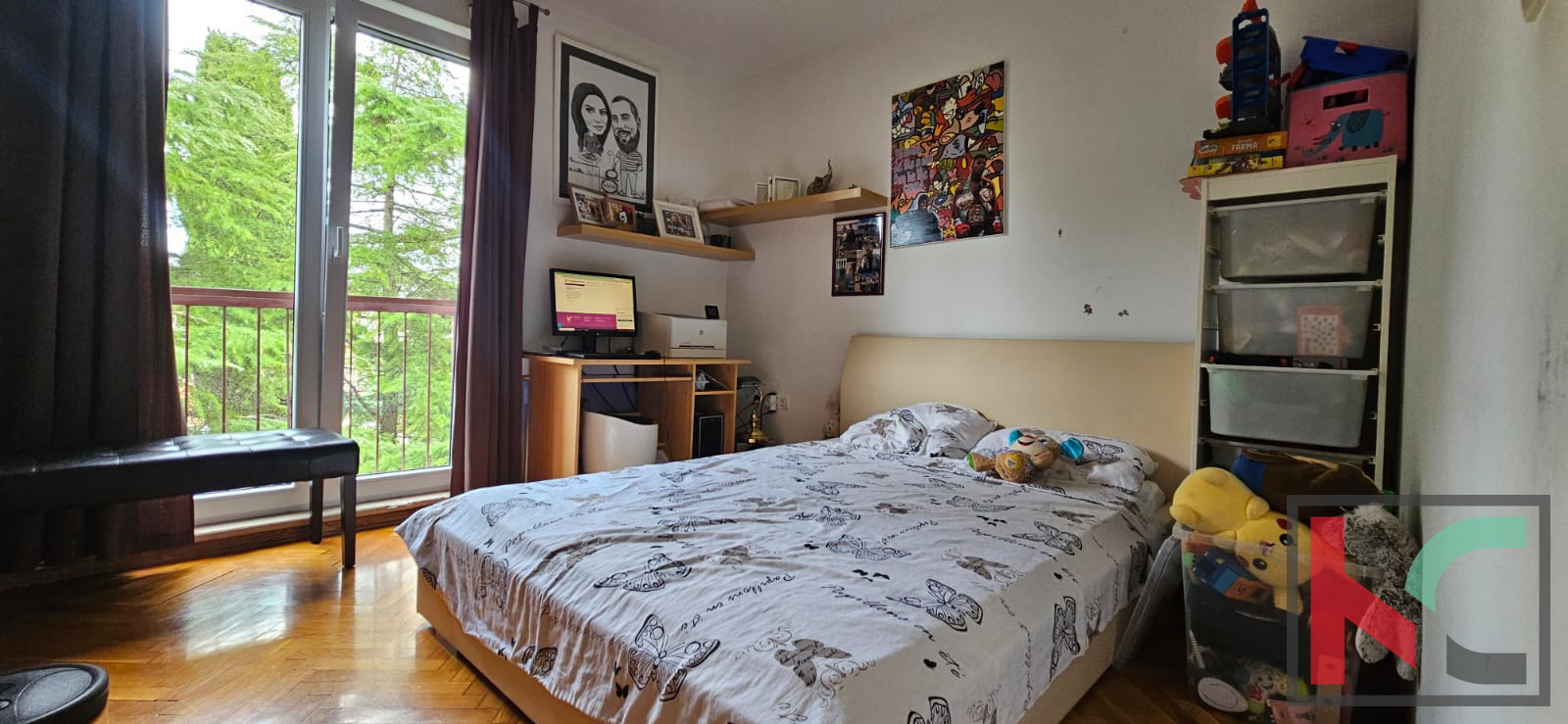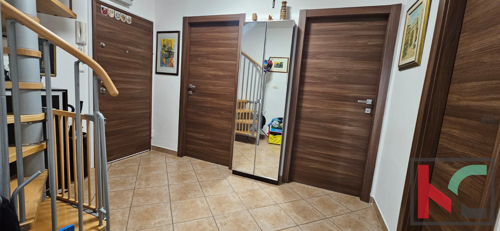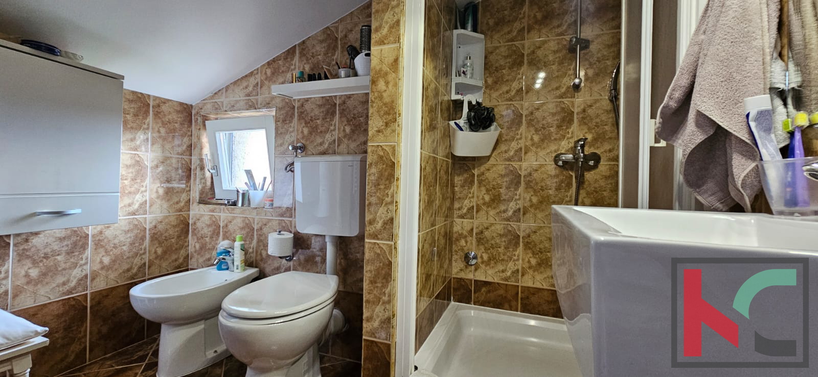 The apartment has a total area of 87m2. On the first level, there is a spacious entrance hall, two large and bright bedrooms, a bathroom with a shower, washing machine, and dryer, a kitchen with a dining area, and a living room with access to a balcony. We go up to the second level where there is an ironing space, one larger bedroom with low built-in wardrobes, and another bathroom. The apartment is located in a quiet area with a beautiful view, close to nature, and in a very sunny position, making it especially comfortable for everyday living.
