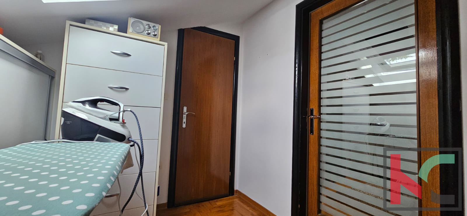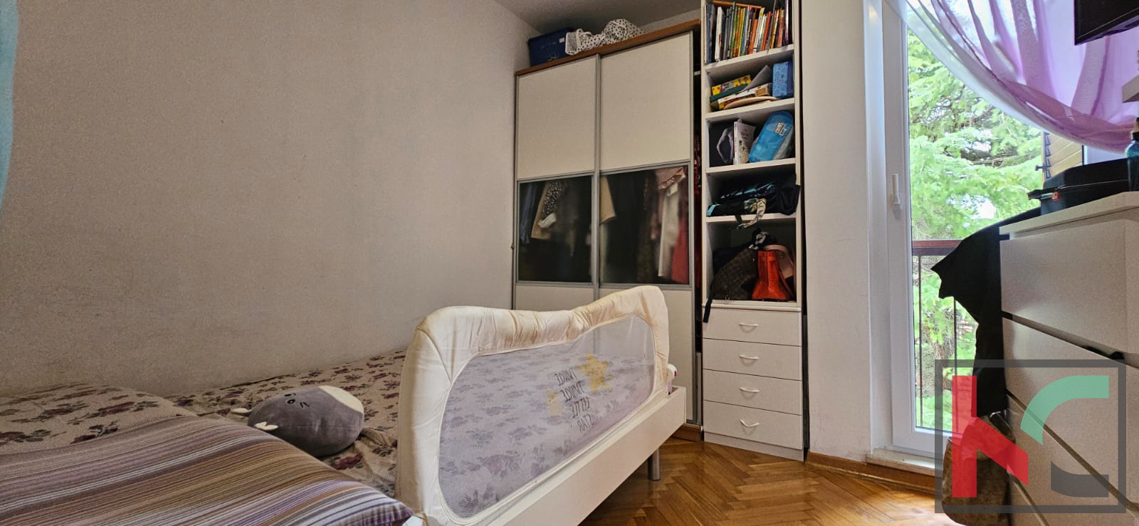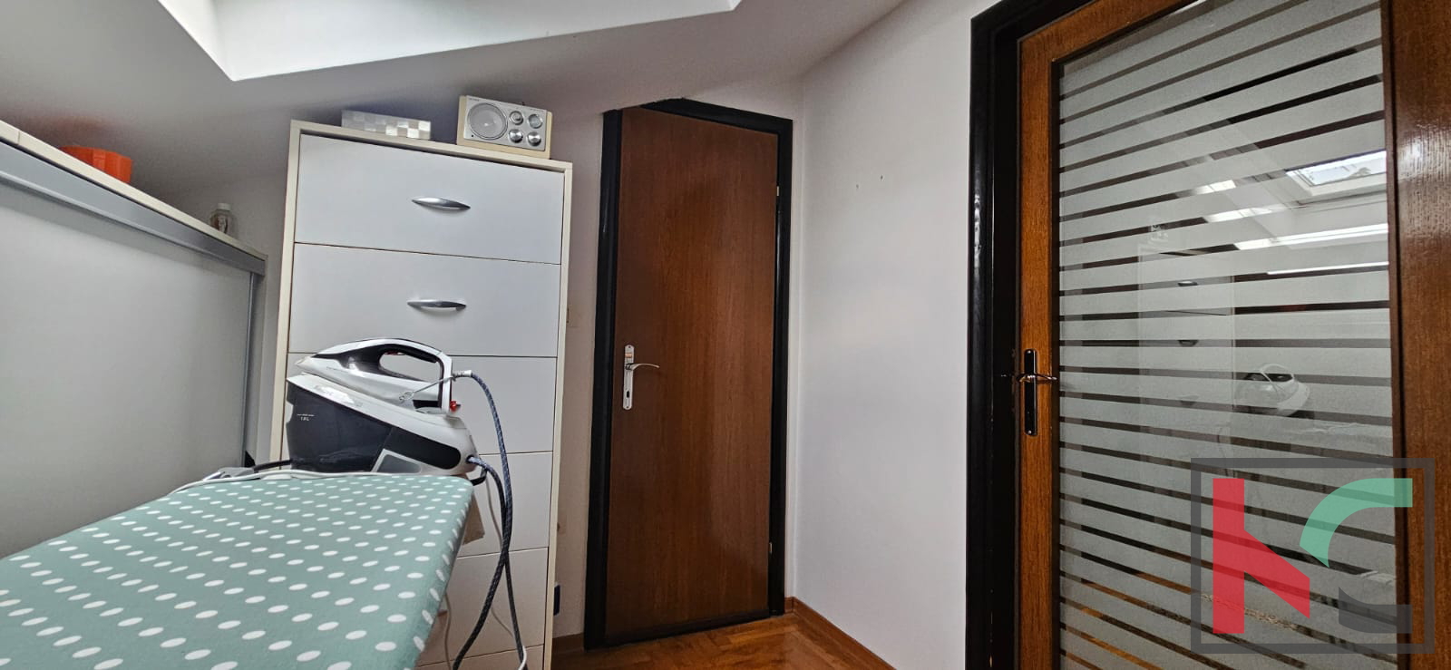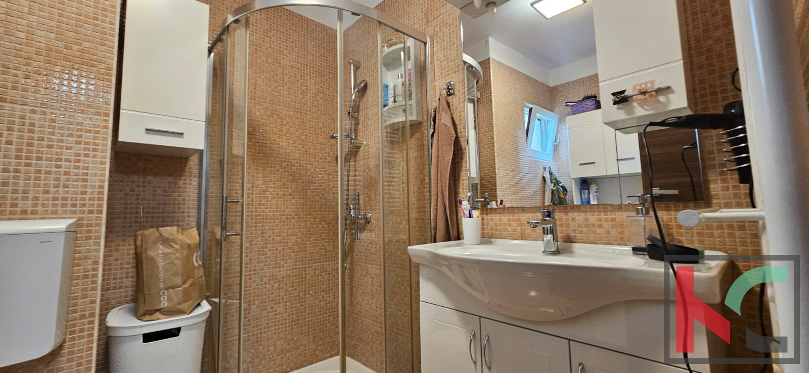 The apartment has a total area of 87m2. On the first level, there is a spacious entrance hall, two large and bright bedrooms, a bathroom with a shower, washing machine, and dryer, a kitchen with a dining area, and a living room with access to a balcony. We go up to the second level where there is an ironing space, one larger bedroom with low built-in wardrobes, and another bathroom. The apartment is located in a quiet area with a beautiful view, close to nature, and in a very sunny position, making it especially comfortable for everyday living.