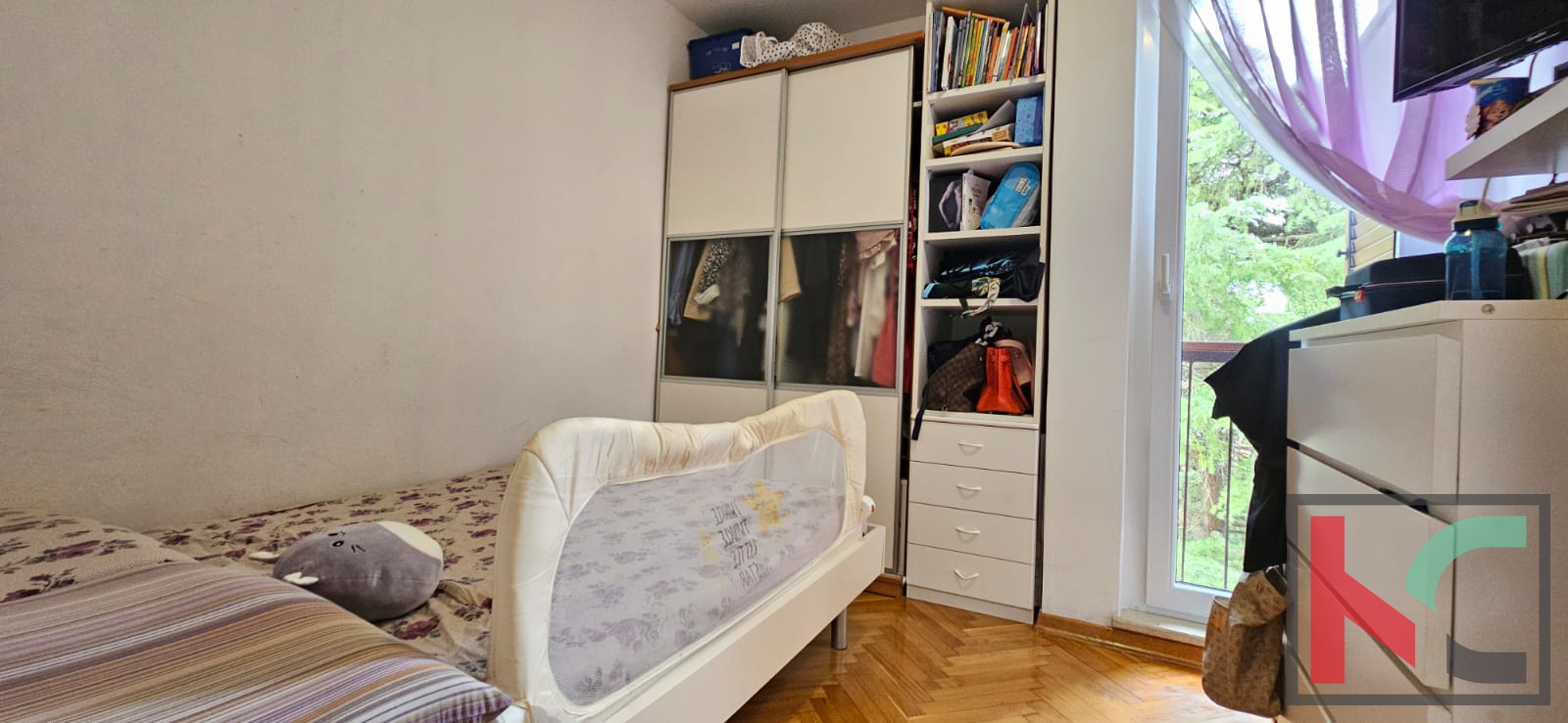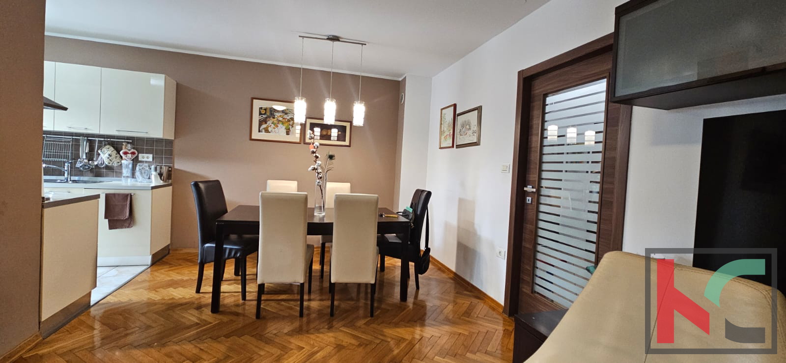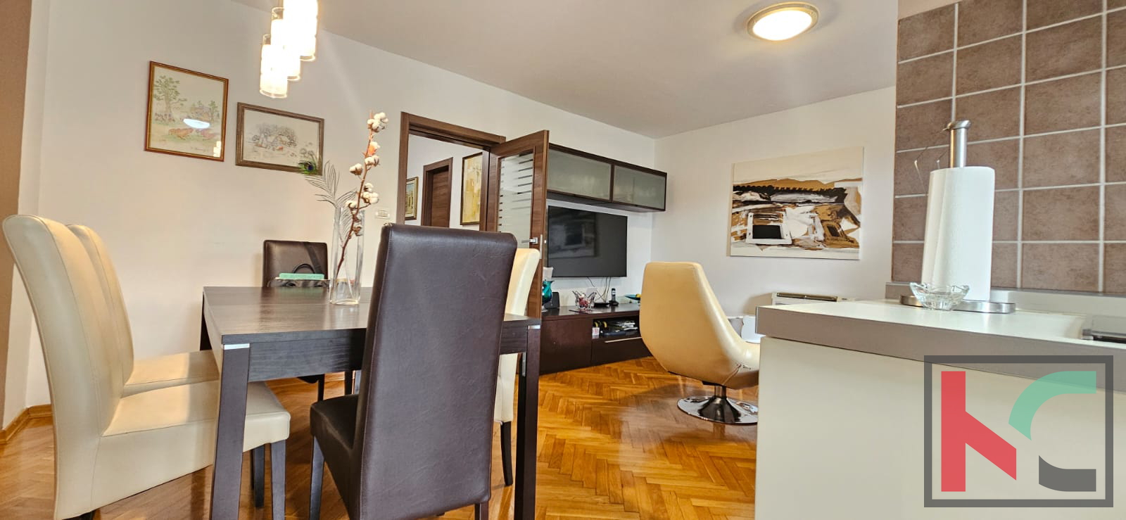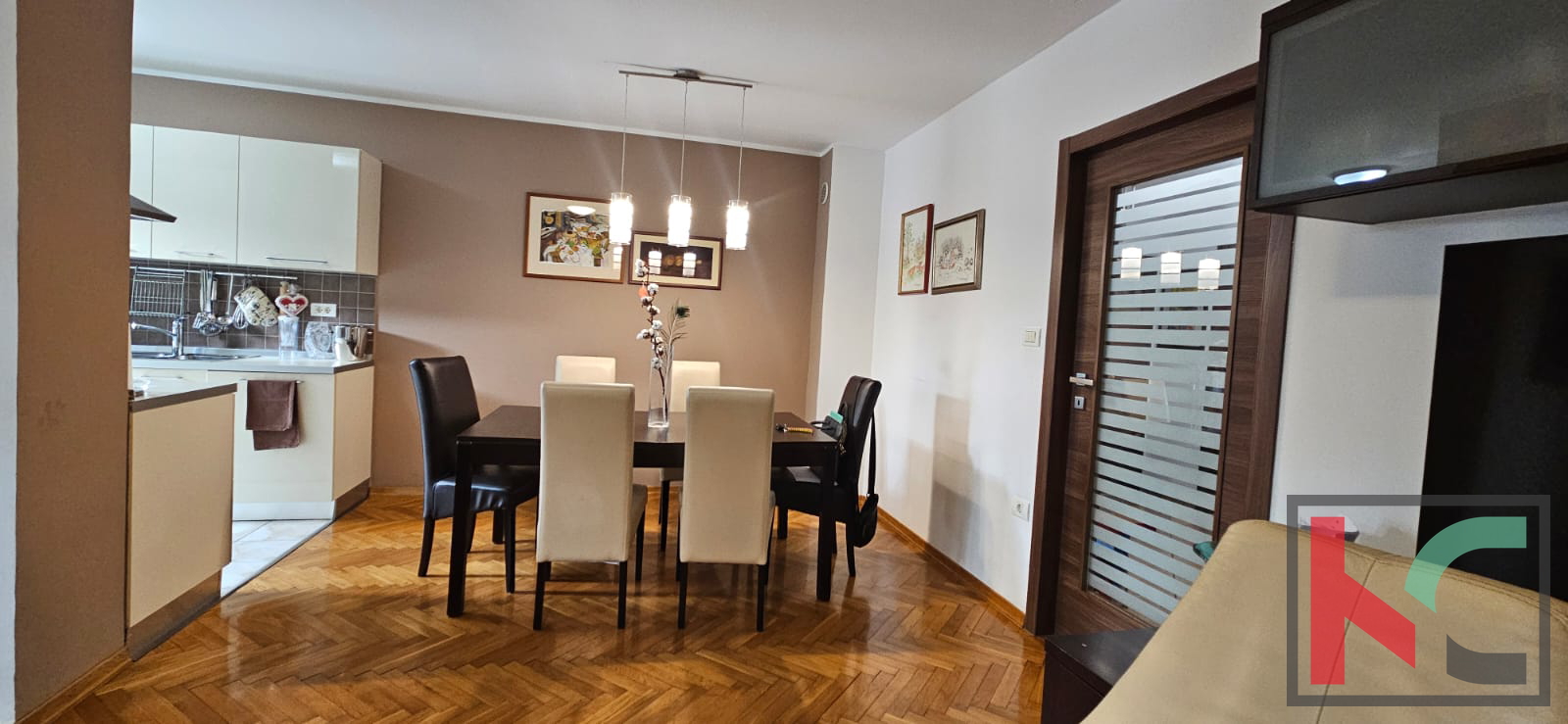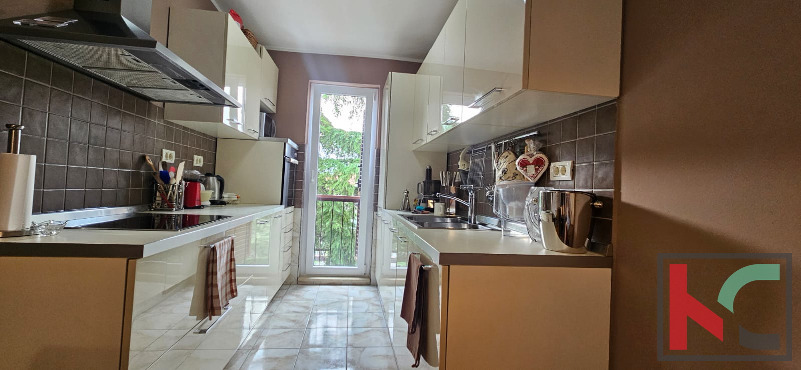 The apartment has a total area of 87m2. On the first level, there is a spacious entrance hall, two large and bright bedrooms, a bathroom with a shower, washing machine, and dryer, a kitchen with a dining area, and a living room with access to a balcony. We go up to the second level where there is an ironing space, one larger bedroom with low built-in wardrobes, and another bathroom. The apartment is located in a quiet area with a beautiful view, close to nature, and in a very sunny position, making it especially comfortable for everyday living.