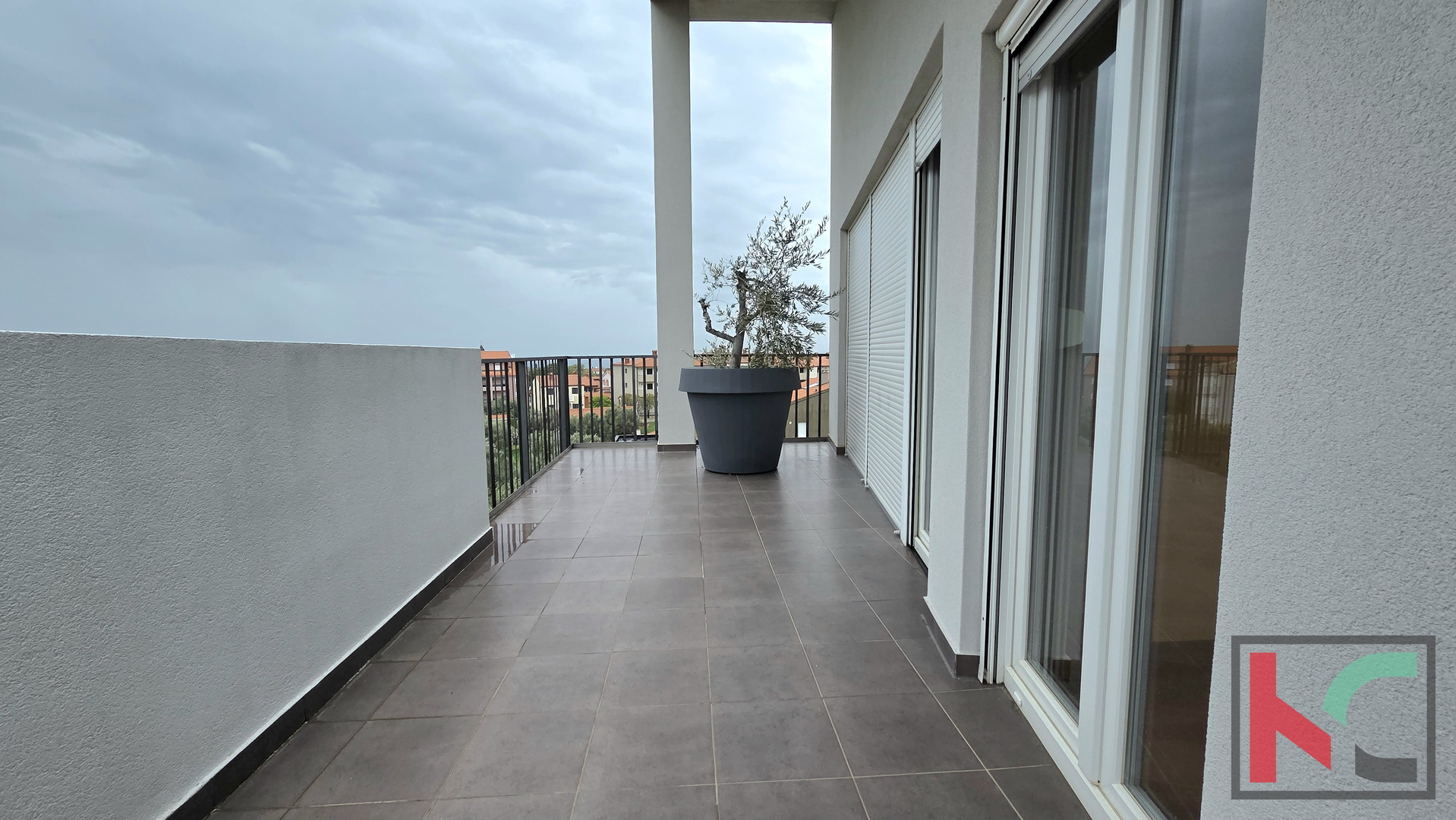Donja etaža stana (109 m2) obuhvaća veliki dnevni boravak povezan s kuhinjom i blagovaonicom, iz kojeg se izlazi na prostranu natkrivenu terasu s pogledom na maslinik – savršeno mjesto za opušten doručak ili obiteljsko druženje. U ovoj etaži smještene su i tri komforne spavaće sobe, moderno opremljena kupaonica s kadom te dodatni gostinjski toalet.