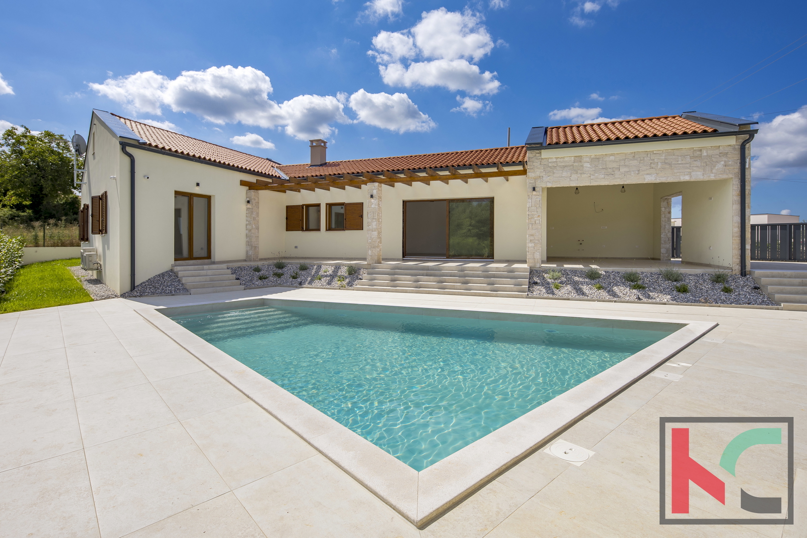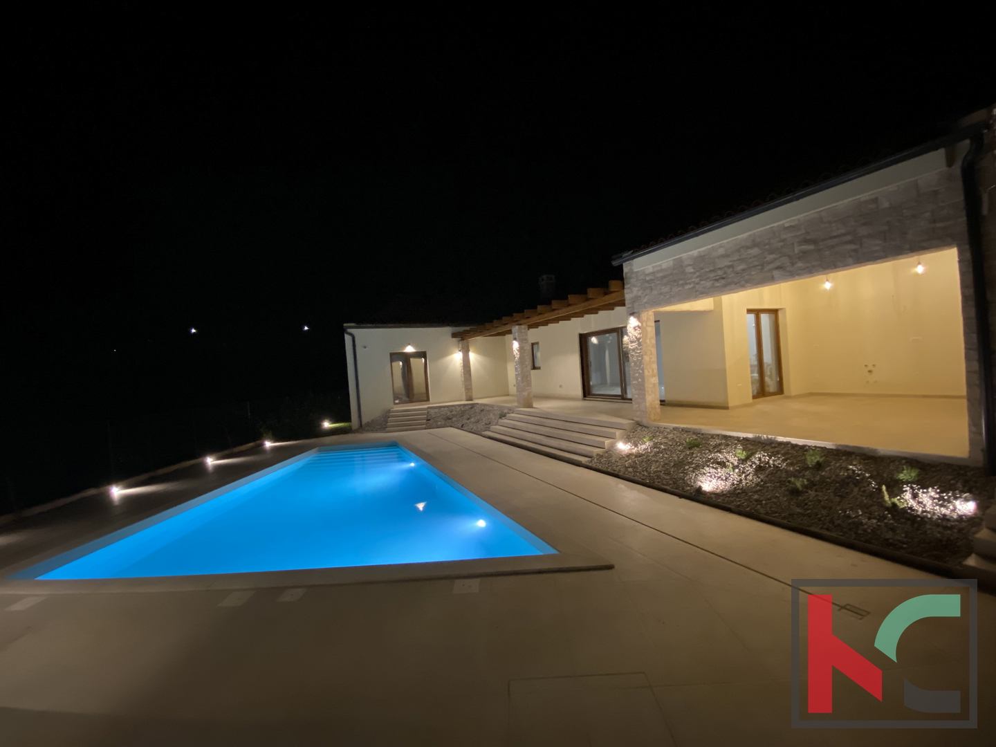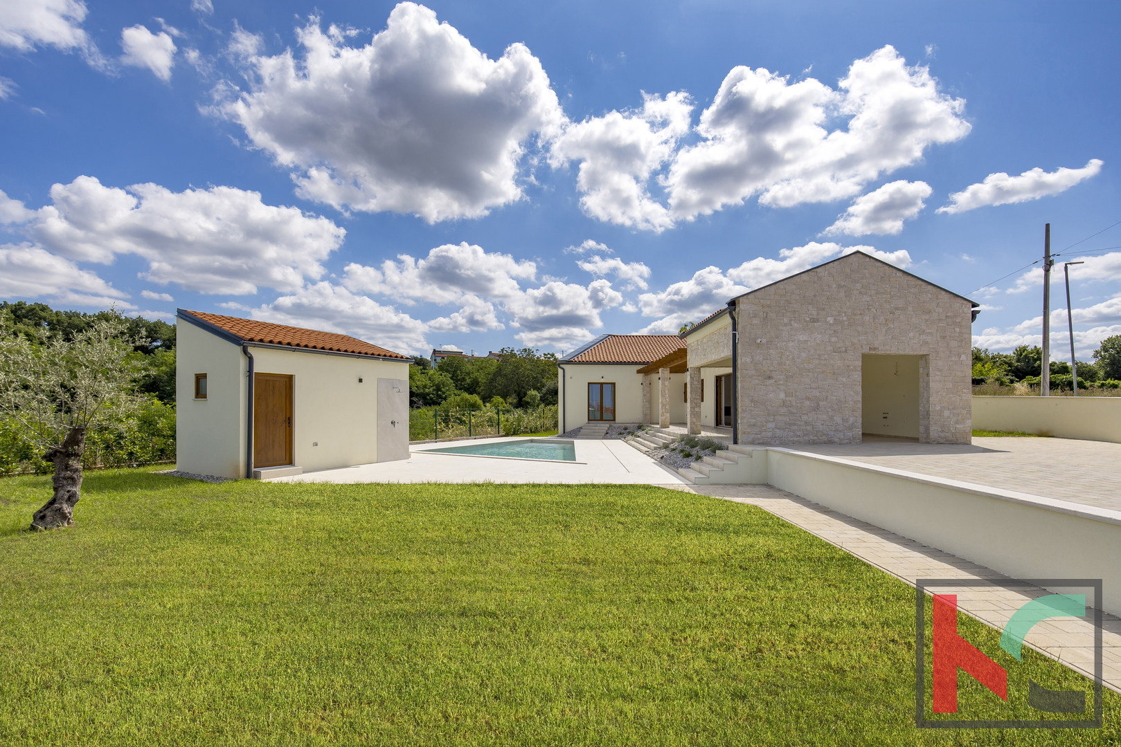Kuća je smještena na parceli od 1002 m2 i nalazi se u mirnom i zelenom okruženju općine Tinjan.Koncept kuće je sljedeći a napravljen tako da nudi spoj komfora i funkcionalnosti: ulazno predsoblje, toalet, tehnička soba koja ima centrali kotao odnosno hidraulički sustav za distribuciju tople vode, hodnik koji razdvaja noćni i dnevni dio prostorija pa se tako sa desne strane kuće nalaze se 3 spavaće sobe 17-18m2,svaka sa predsobljem i garderobnim dijelom te svojim kupatilom od 5m2. Na lijevoj strani kuće nalazi dnevni boravak od 28 m2 te kuhinja i blagovaona od 24,75m2 a sve zajedno u otvorenom prostoru sa pogledom na terasu, bazen i zelenilo. Pored kuhinje izlaz je na natkrivenu ljetnu kuhinju veličine 22m2. Bazen od 42m2 je obložen svijetlom ,kvalitetnom keramikom i okružen je ugodno uređenim sunčalištem sa vanjskim tušem i toaletom.