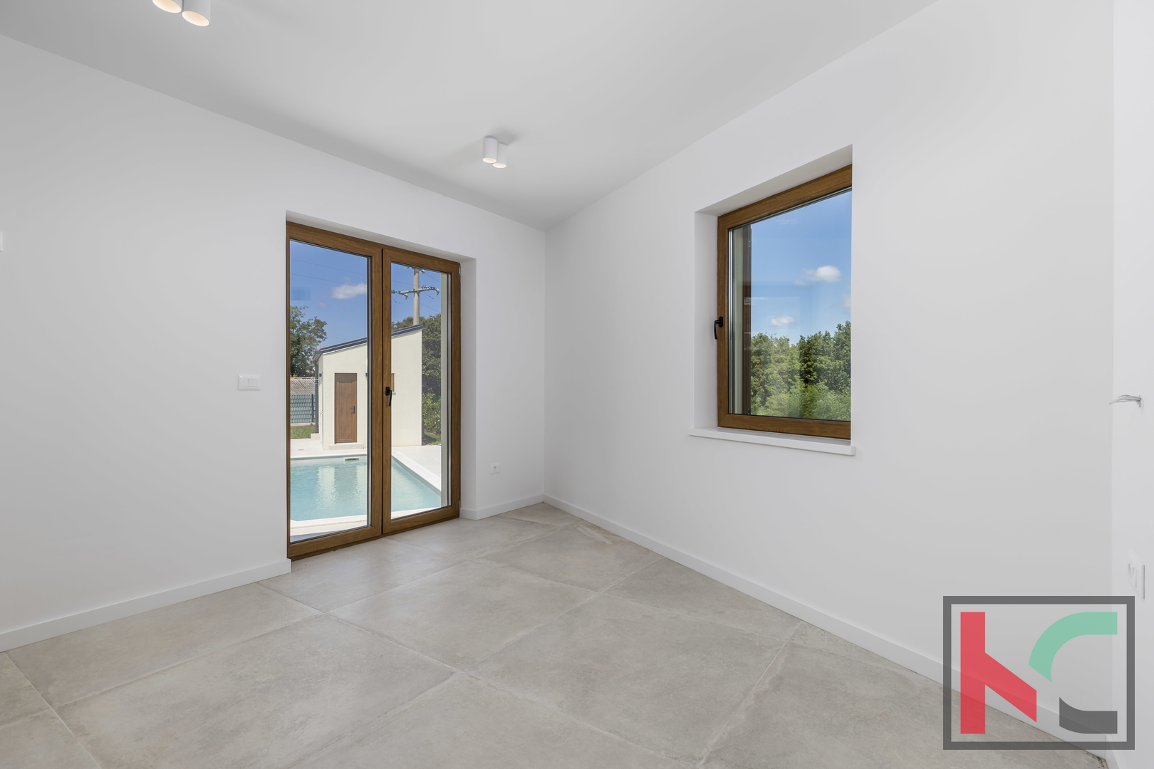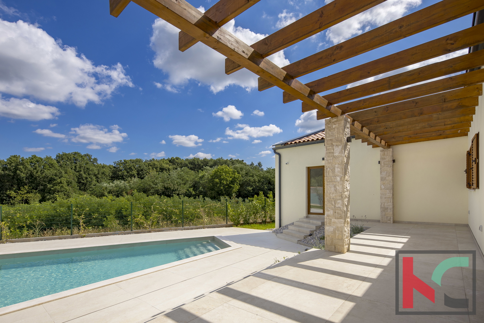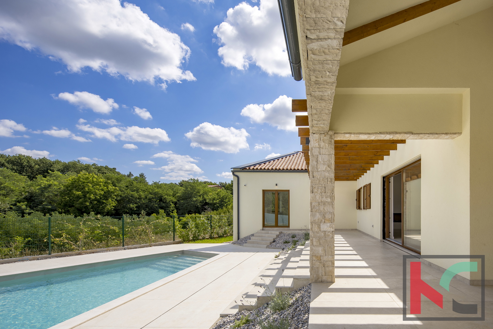 Kuća je smještena na parceli od 1002 m2 i nalazi se u mirnom i zelenom okruženju općine Tinjan.Koncept kuće je sljedeći a napravljen tako da nudi spoj komfora i funkcionalnosti: ulazno predsoblje, toalet, tehnička soba koja ima centrali kotao odnosno hidraulički sustav za distribuciju tople vode, hodnik koji razdvaja noćni i dnevni dio prostorija pa se tako sa desne strane kuće nalaze se 3 spavaće sobe 17-18m2,svaka sa predsobljem i garderobnim dijelom te svojim kupatilom od 5m2. Na lijevoj strani kuće nalazi dnevni boravak od 28 m2 te kuhinja i blagovaona od 24,75m2 a sve zajedno u otvorenom prostoru sa pogledom na terasu, bazen i zelenilo. Pored kuhinje izlaz je na natkrivenu ljetnu kuhinju veličine 22m2. Bazen od 42m2 je obložen svijetlom ,kvalitetnom keramikom i okružen je ugodno uređenim sunčalištem sa vanjskim tušem i toaletom.