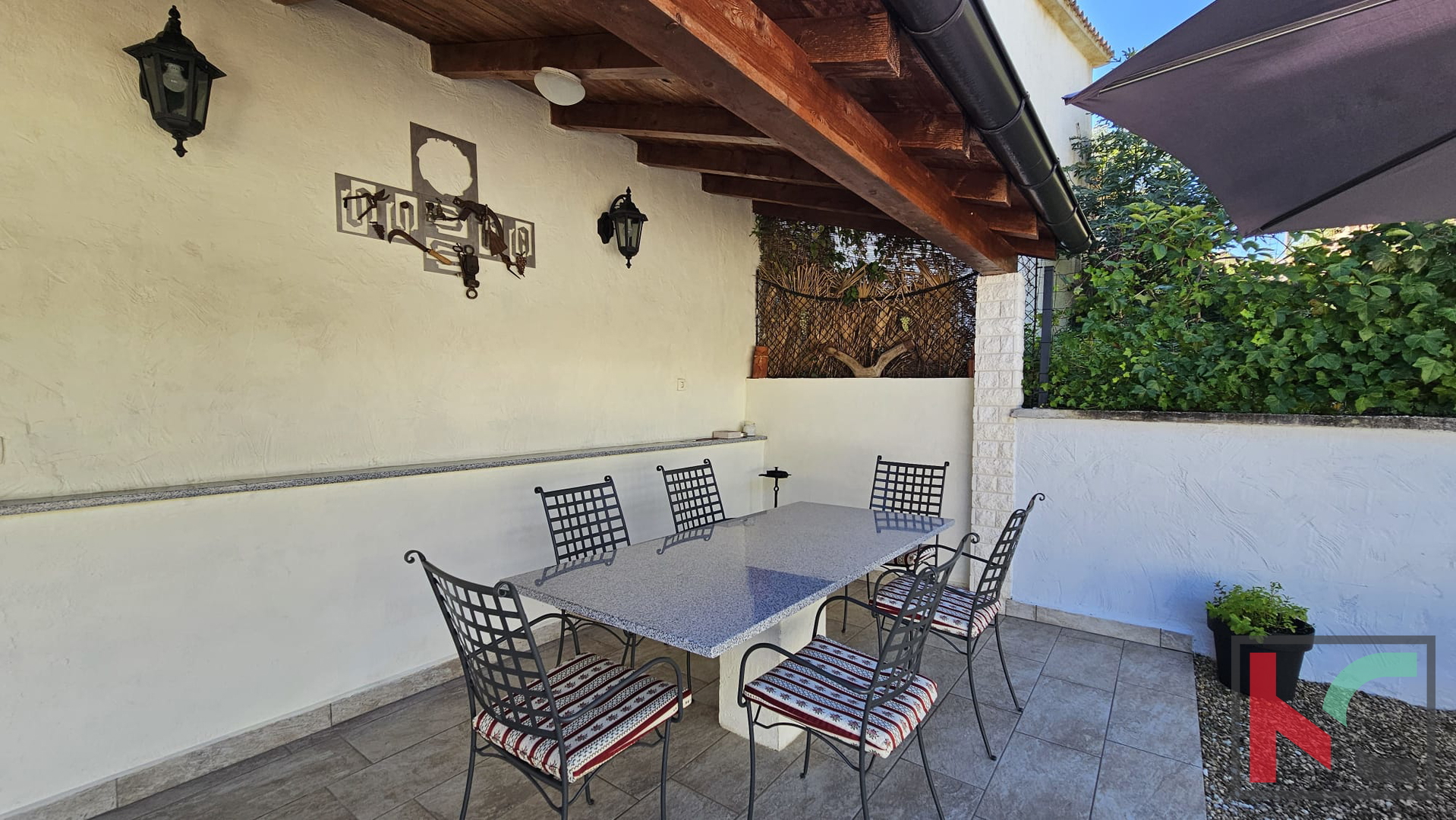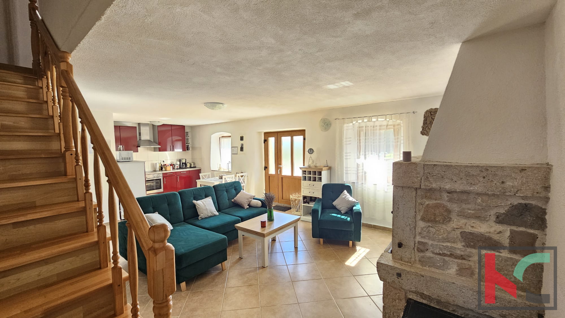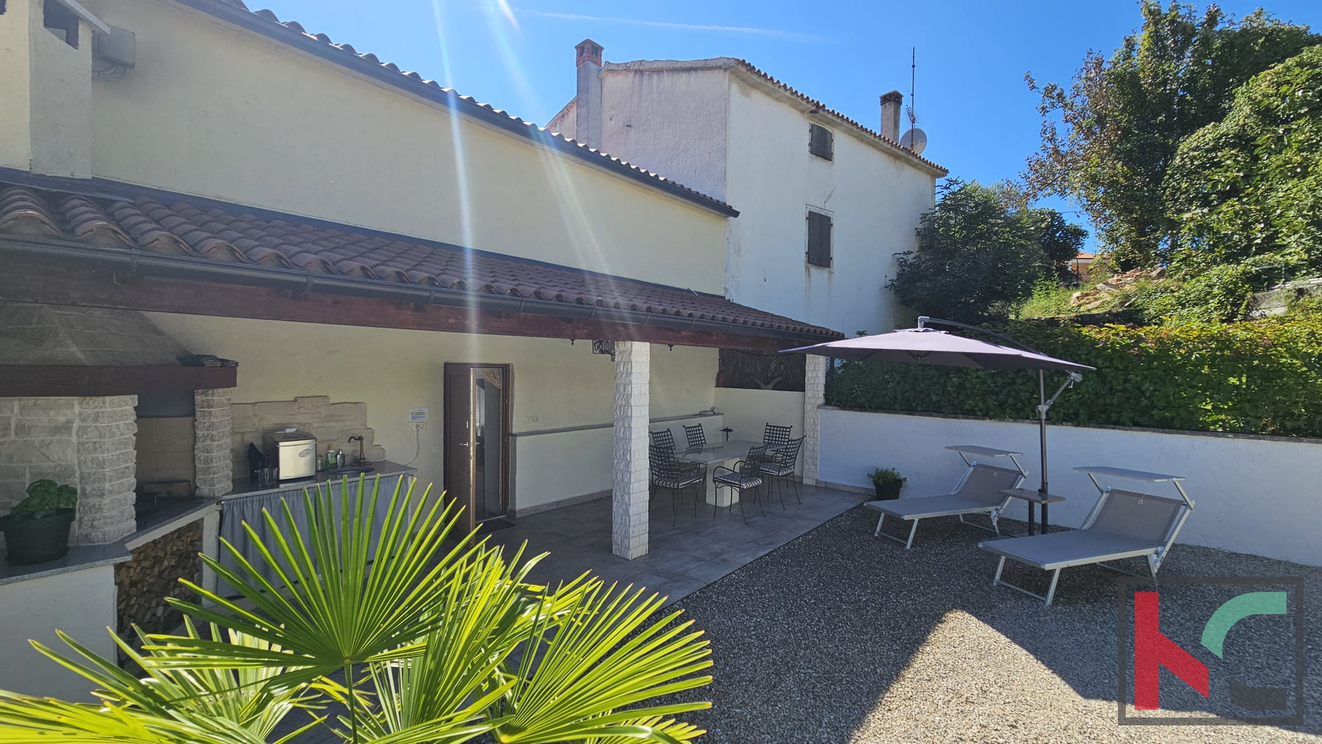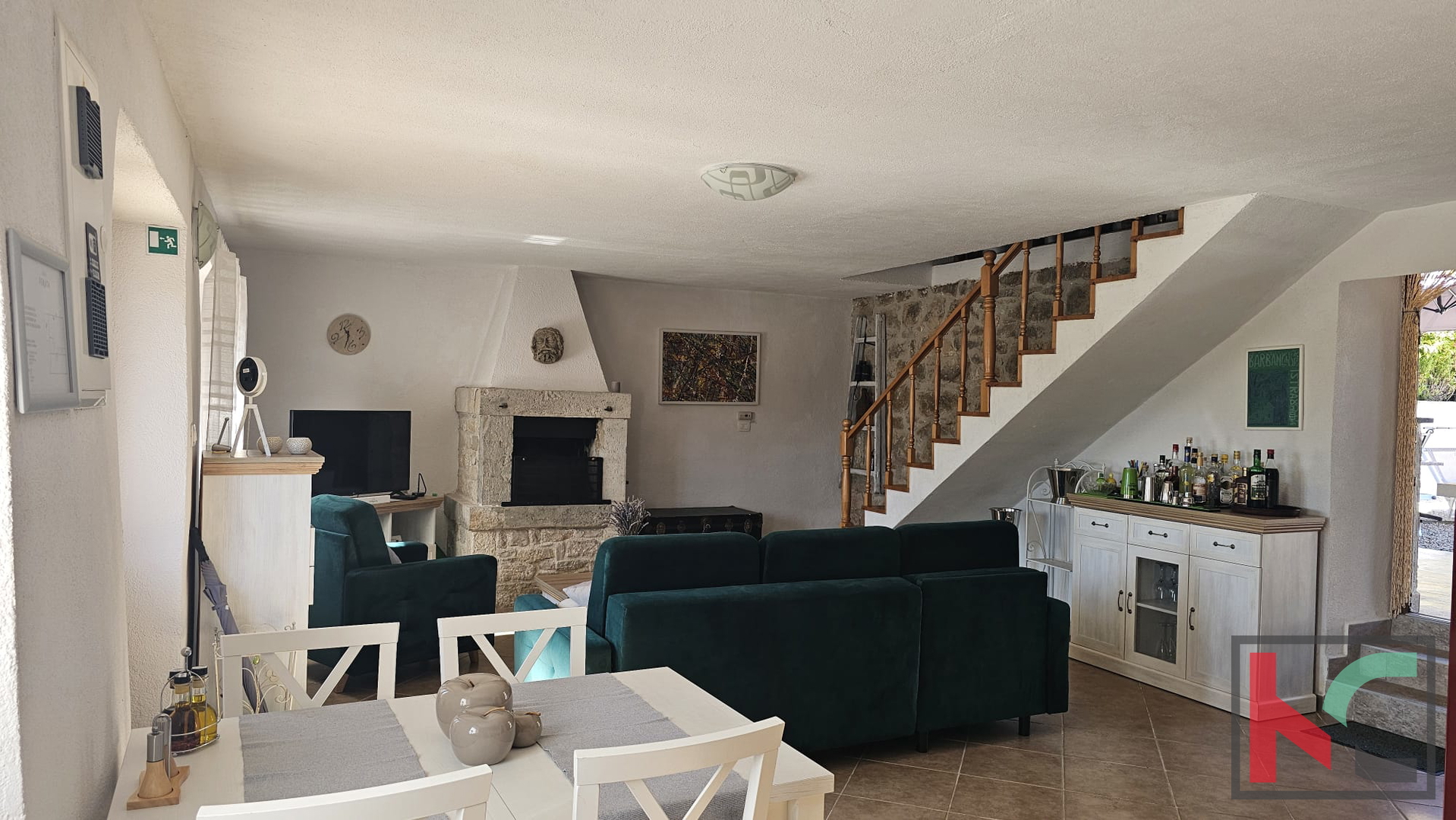 U prizemlju se nalazi ugodno uređen dnevni prostor koji se sastoji od otvorene kuhinje sa blagovaonom i dnevnim boravkom. U središtu dnevnog boravka nalazi se kamin koji daje poseban ugođaj i toplinu svakodnevnom životu. Tu se također nalazi jedna kupaonica. Iz dnevnog boravka se izlazi na prostranu natkrivenu terasu, idealnu za opuštanje i boravak na otvorenom. Vanjski roštilj je savršen za druženja s obitelji i prijateljima. U nastavku je ograđeno dvorište prekriveno kamenčićima što prostoru prostoru daje prirodan izgled, a istovremeno nudi jednostavnost održavanja. Pripremljene su instalacije struje i vode za bazen. Dodatna pogodnost je punionica za električni automobil, što ovu nekretninu čini prilagođenom suvremenim potrebama.