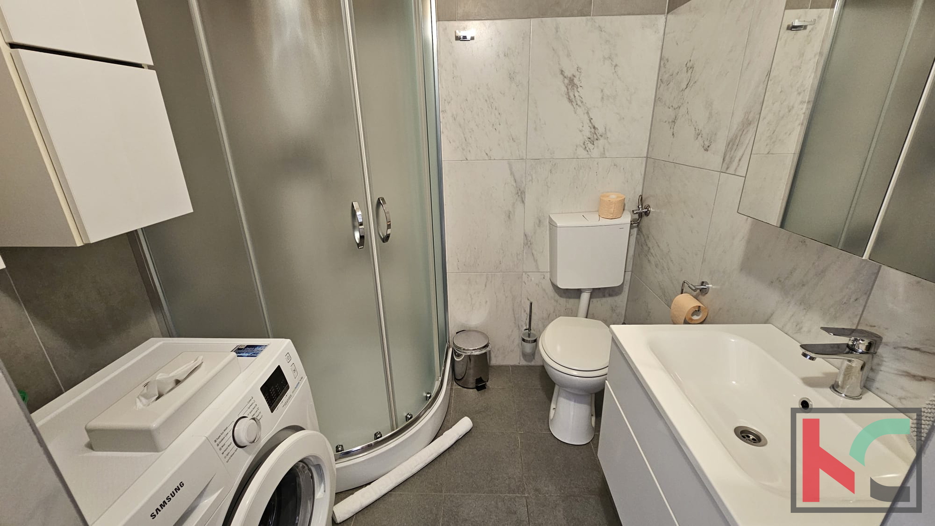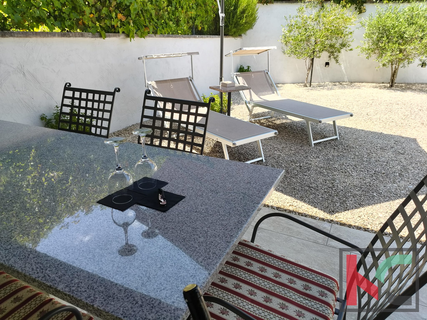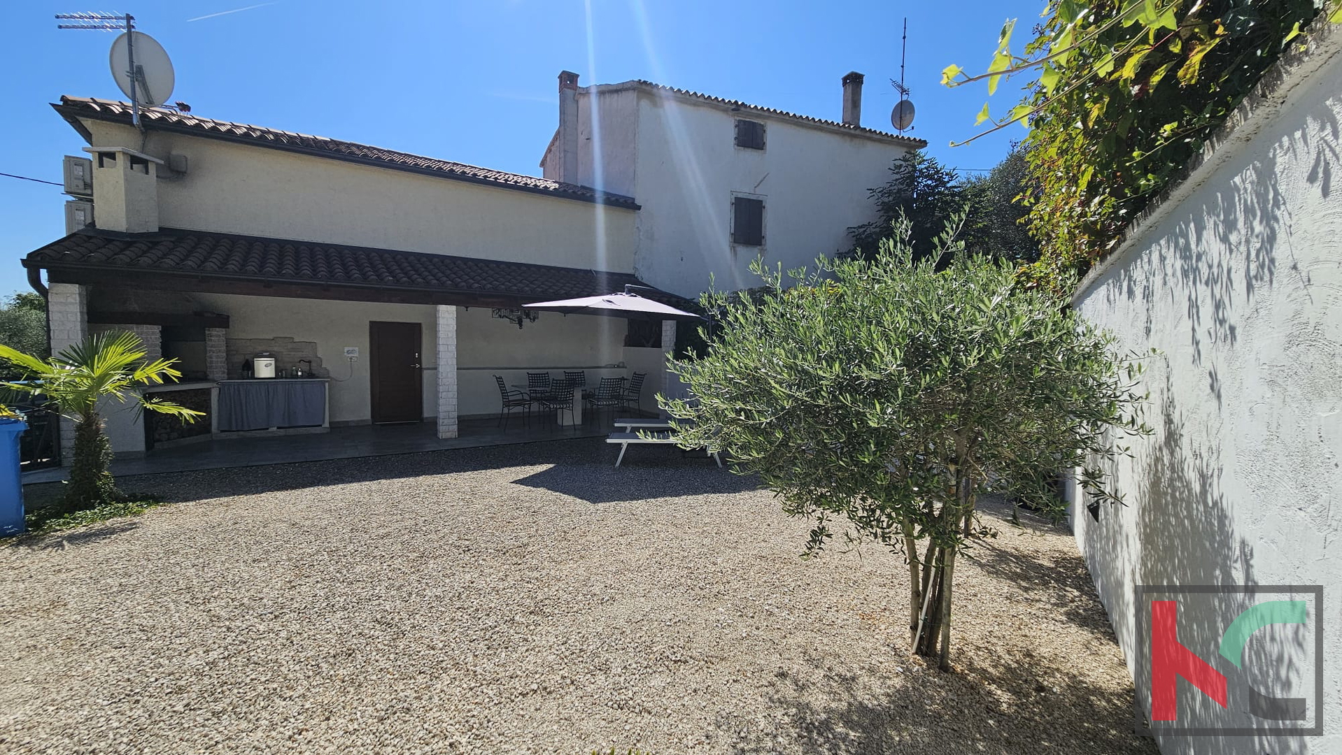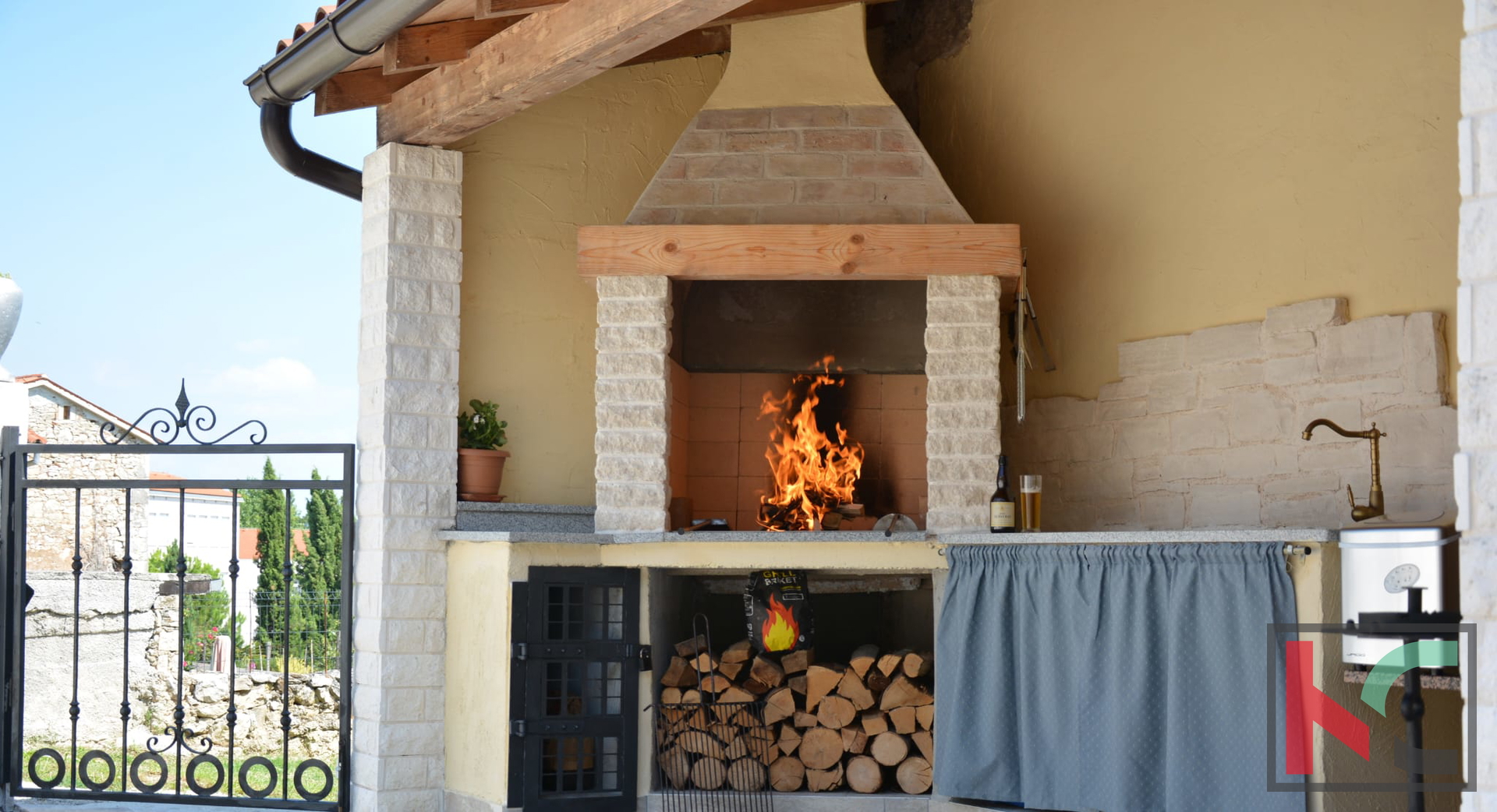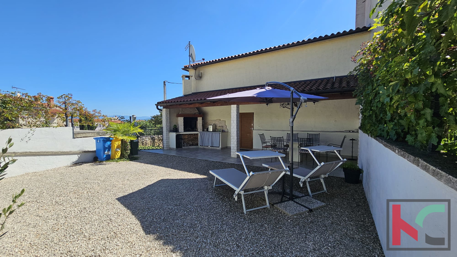 U prizemlju se nalazi ugodno uređen dnevni prostor koji se sastoji od otvorene kuhinje sa blagovaonom i dnevnim boravkom. U središtu dnevnog boravka nalazi se kamin koji daje poseban ugođaj i toplinu svakodnevnom životu. Tu se također nalazi jedna kupaonica. Iz dnevnog boravka se izlazi na prostranu natkrivenu terasu, idealnu za opuštanje i boravak na otvorenom. Vanjski roštilj je savršen za druženja s obitelji i prijateljima. U nastavku je ograđeno dvorište prekriveno kamenčićima što prostoru prostoru daje prirodan izgled, a istovremeno nudi jednostavnost održavanja. Pripremljene su instalacije struje i vode za bazen. Dodatna pogodnost je punionica za električni automobil, što ovu nekretninu čini prilagođenom suvremenim potrebama.