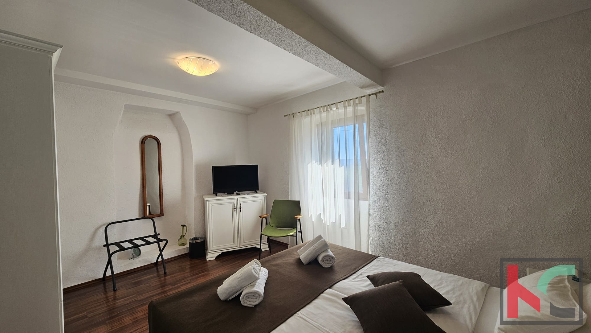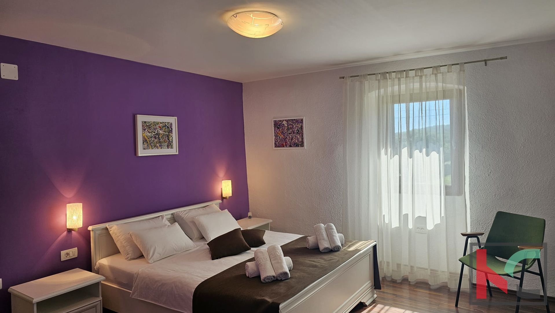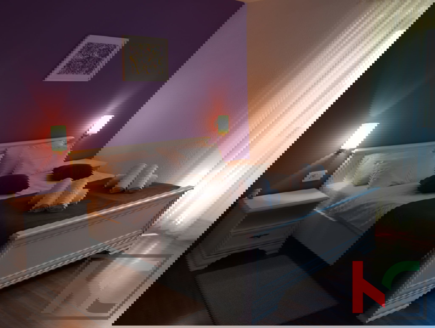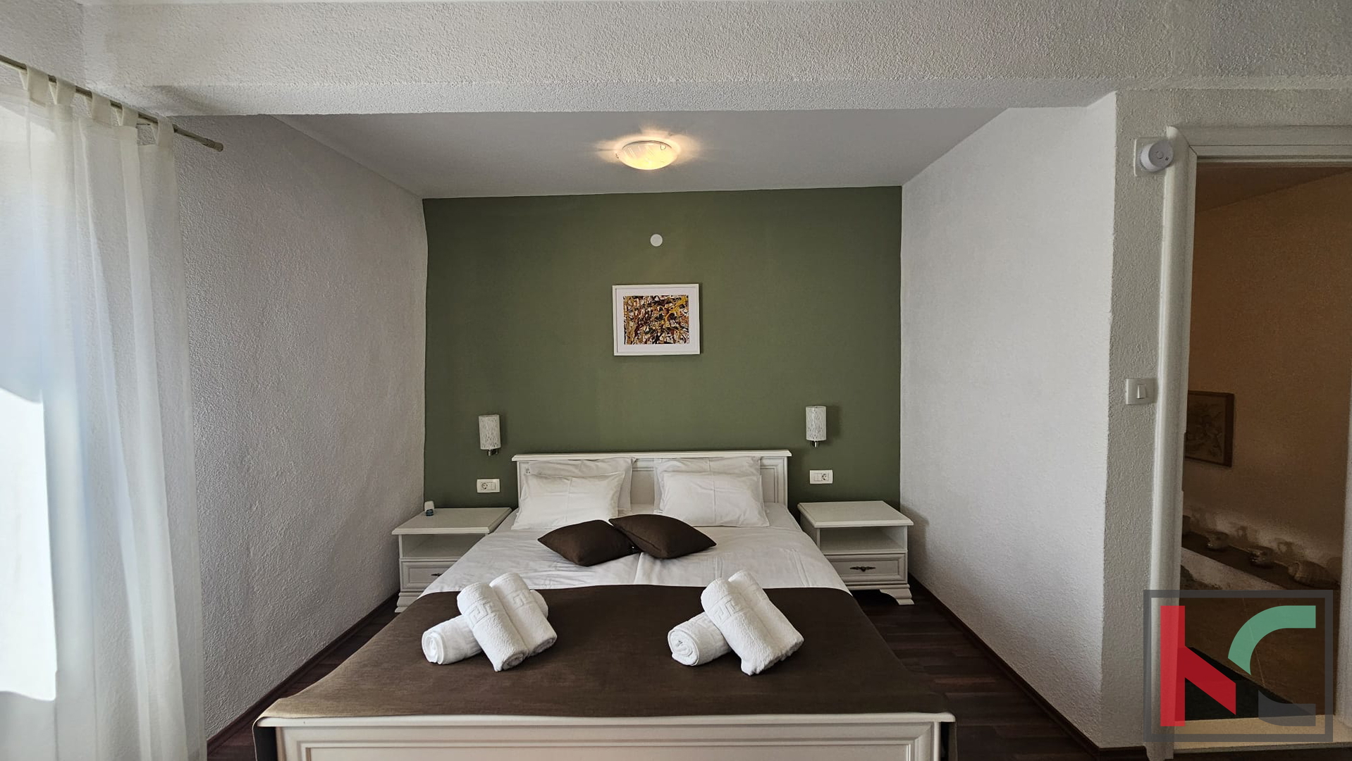 Unutarnje stepenište vodi do spavaćeg dijela. Tu su se smjestile dvije vrlo ugodno uređene spavaće sobe te dodatna kupaonica što omogućava komfor. Regulacija topline osigurana je sa tri zasebne klimatske jedinice. Kuća je potpuno namještena te se kao takva prodaje što omogućava budućim vlasnicima korištenje u minimalnom roku bez dodatnih ulaganja. Parkirno mjesto dostupno je na javnoj površini pored kuće.