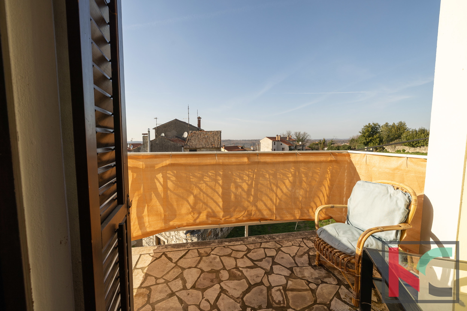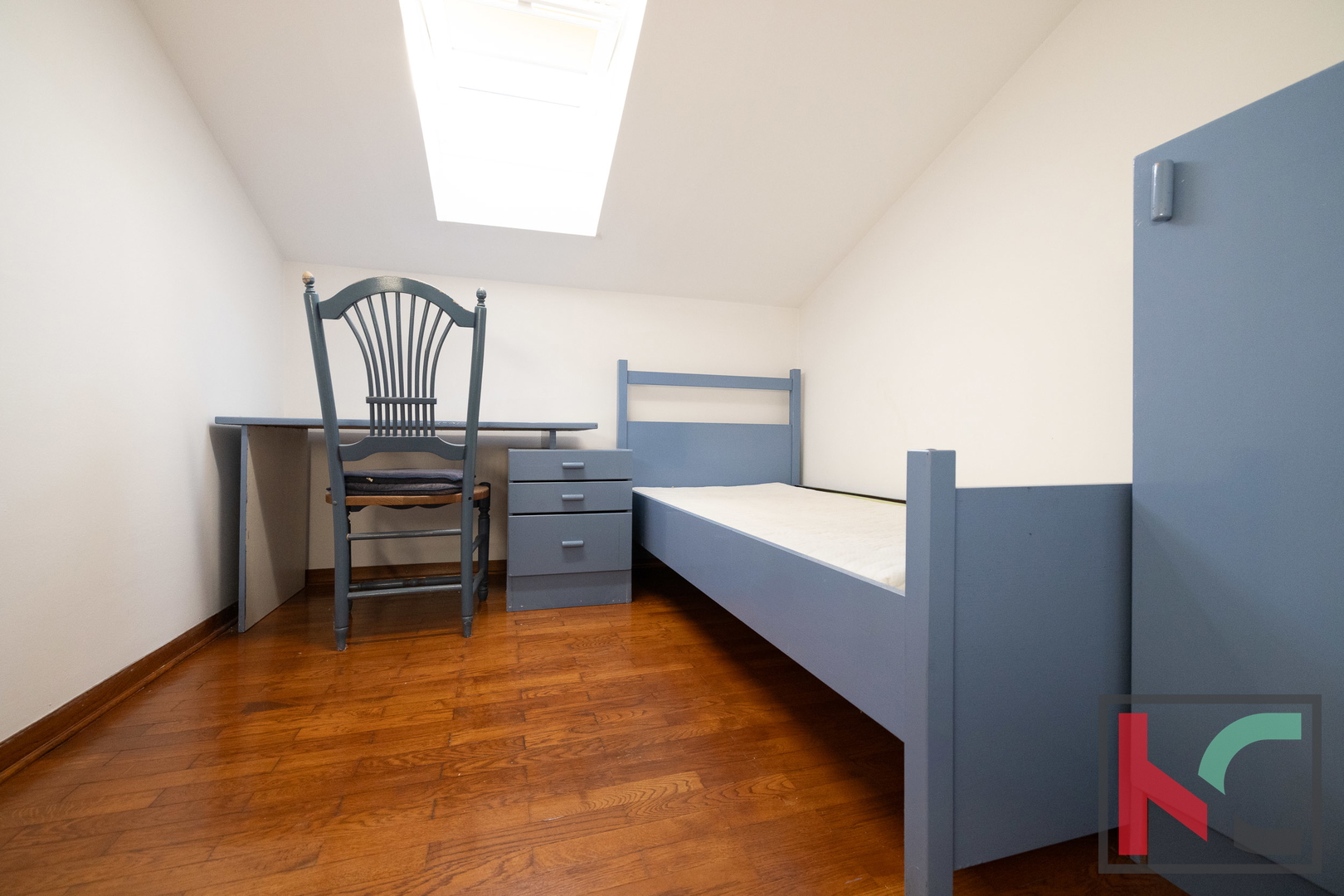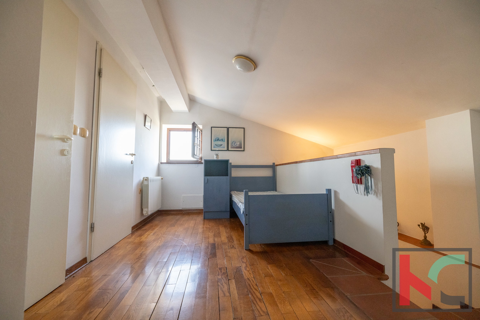 Master spavaća soba ima izlaz na manji balkon sa zapadnom orijentacijom, s kojeg se pruža očaravajući panoramski pogled – od Triglava, Savudrije pa sve do Poreča. Unutarnje stubište koje povezuje sve etaže obloženo je kvalitetnom terracottom, dok su sobe uređene hrastovim parketom, a kupaonice obložene keramikom. Ugrađena je drvena stolarija rađena po mjeri, a u potkrovlju su postavljeni Velux krovni prozori s unutarnjim sjenilima koji osiguravaju ugodnu svjetlost i ventilaciju.