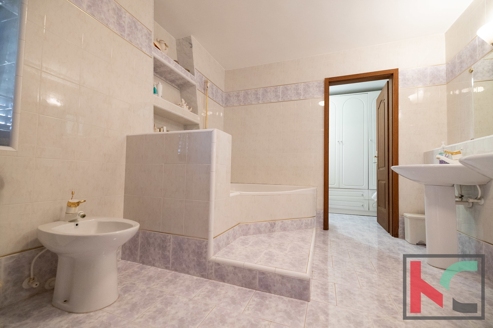 - Drugi kat: master spavaća soba s elegantnim namještajem, velika kupaonica (kada, tuš, bide, WC, dva umivaonika), utility prostor s ormarima i perilicom rublja. Balkon sa zapadnom orijentacijom i pogledom sve do Savudrije i Poreča.