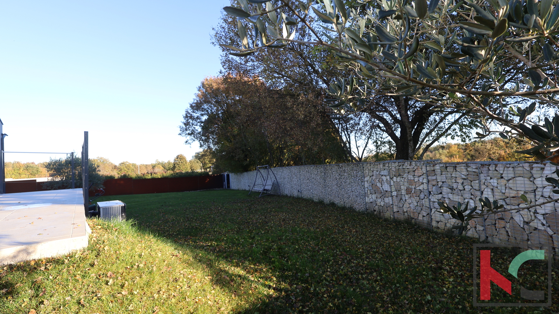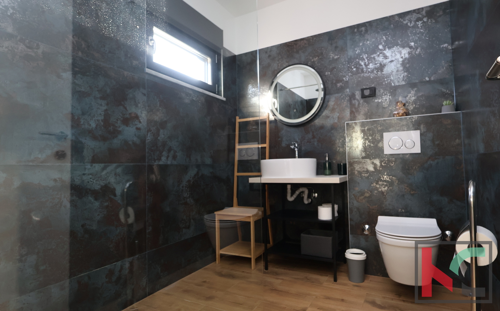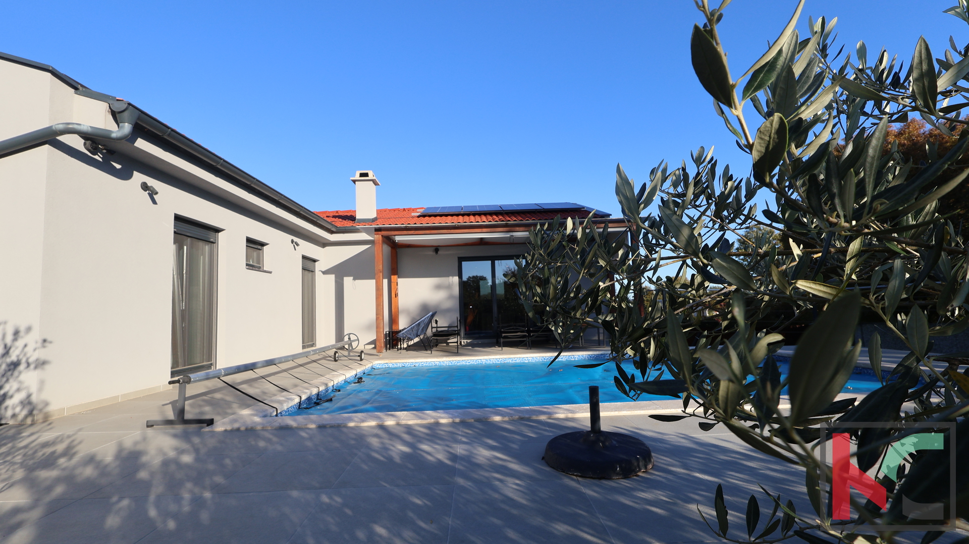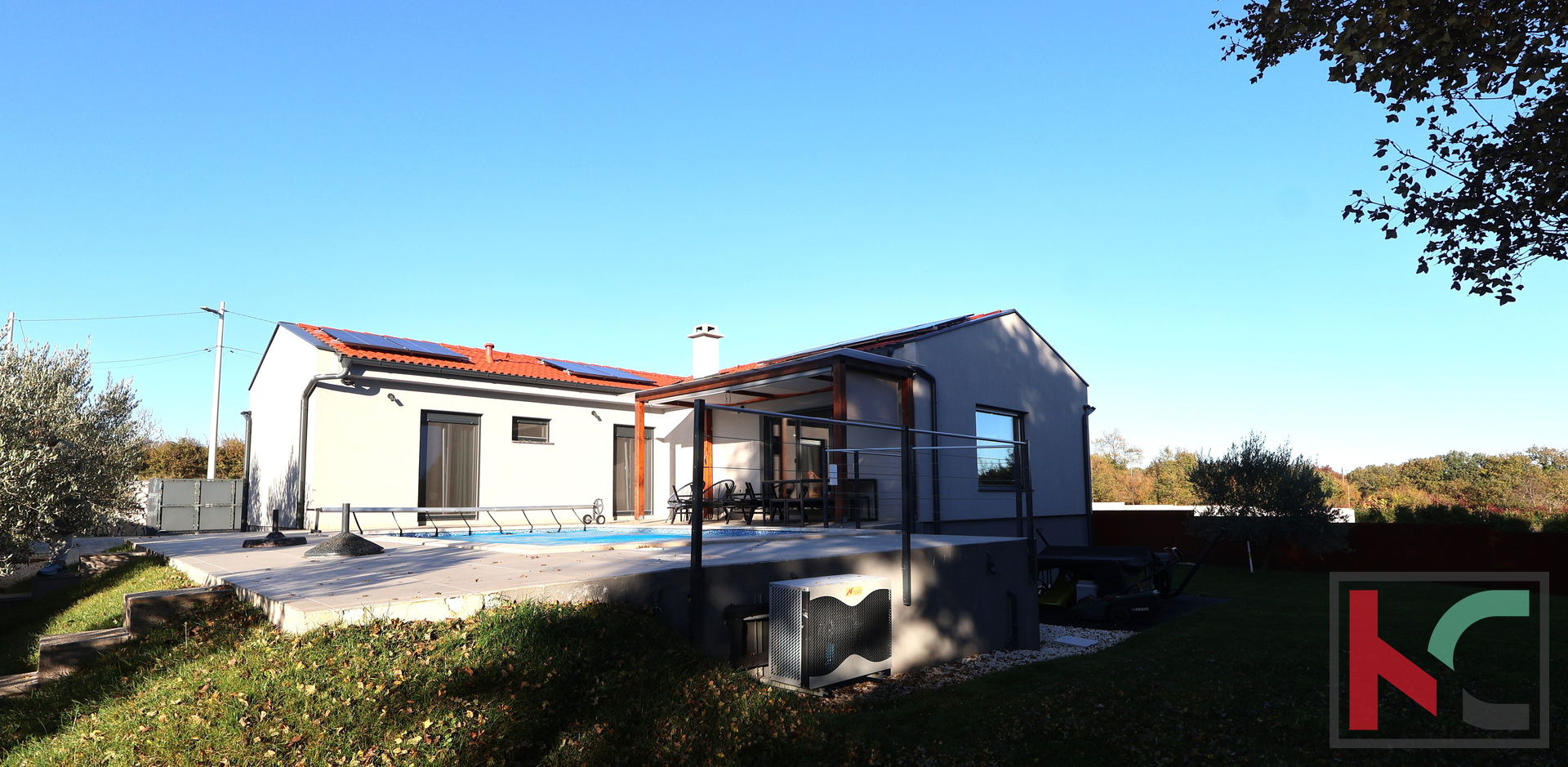 U malom selu Općine Barban, prodajemo prizemnicu s bazenom, montažne gradnje, izgrađenu 2022. godine. Nekretnina se sastoji od 119 m2 netto stambenog prostora te se nalazi na okućnici ukupne kvadrature 814 m2.Sastoji se od hodnika iz kojeg ulazimo u tri spavaće sobe, gostinjski toalet, ostavu i i veliki open space prostor sa kuhinjom, blagovaonom i dnevnim boravkom. Svaka spavaća soba ima vlastitu kupaonicu, u kojima se nalazi podno grijanje. Dvije spavaće sobe imaju izlaz na grijani bazen od 29m2 i natkrivenu terasu. U dnevnom se boravku nalazi kamin i infracrvena sauna te veliki prozor sa pogledom na prirodu i zelenilo.