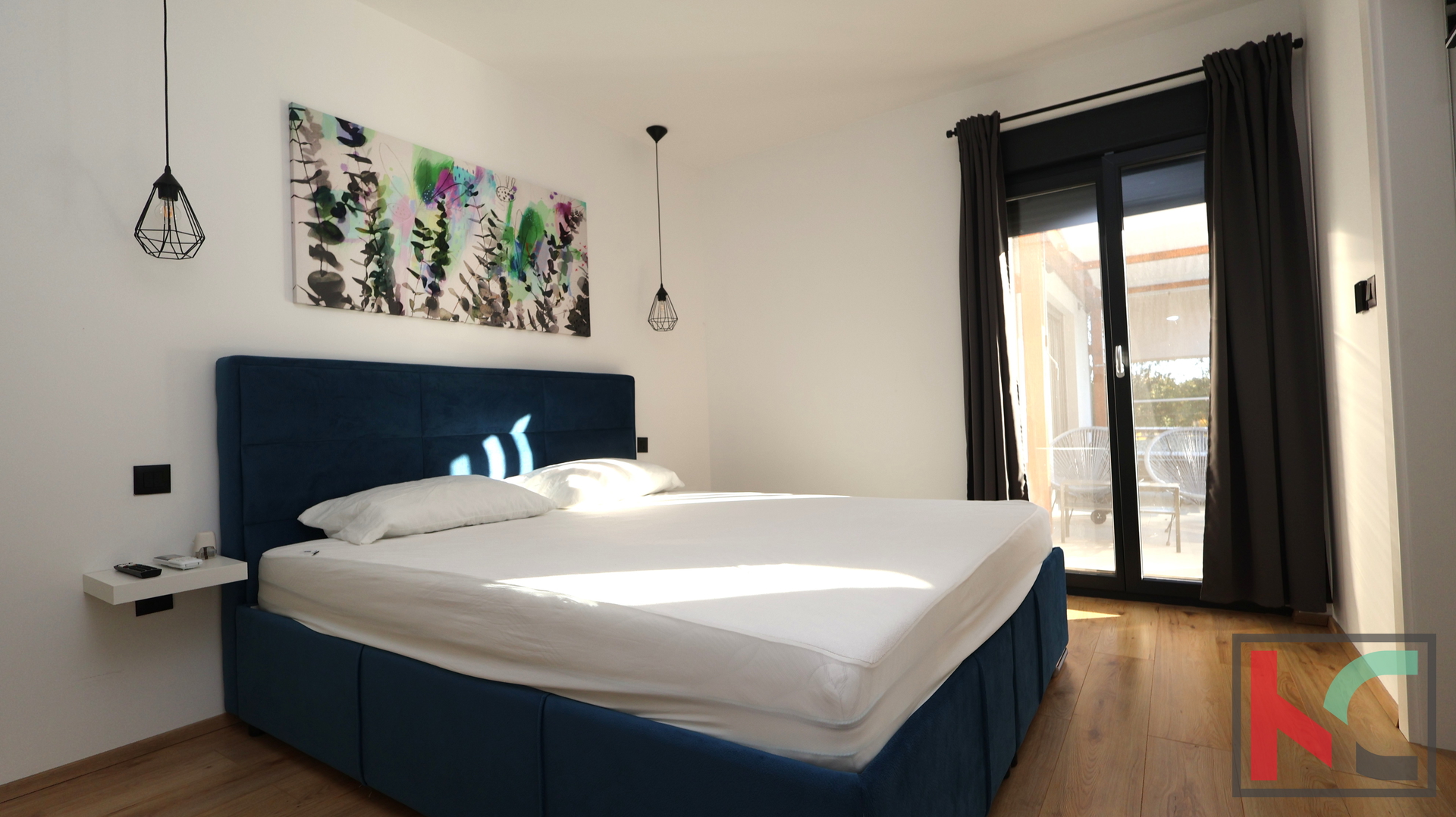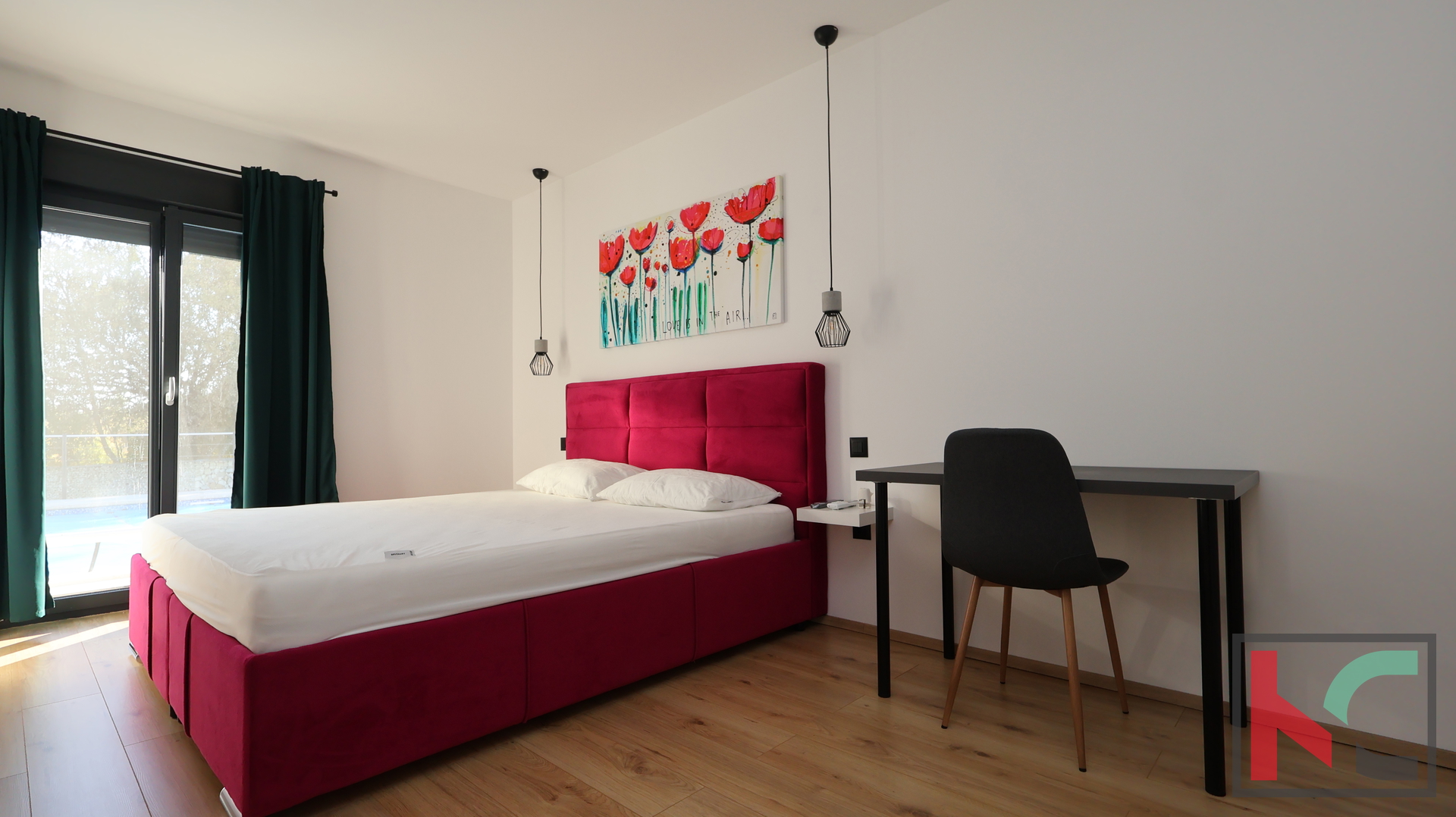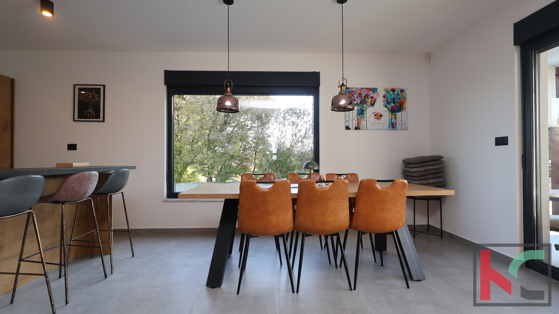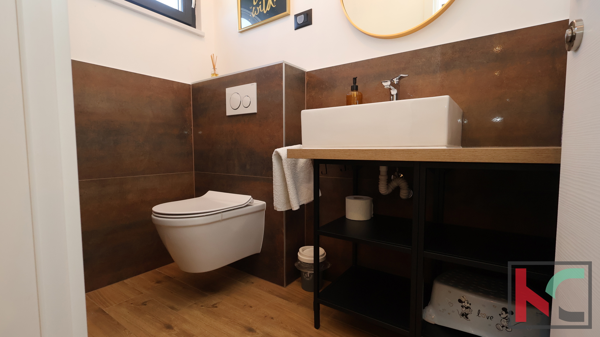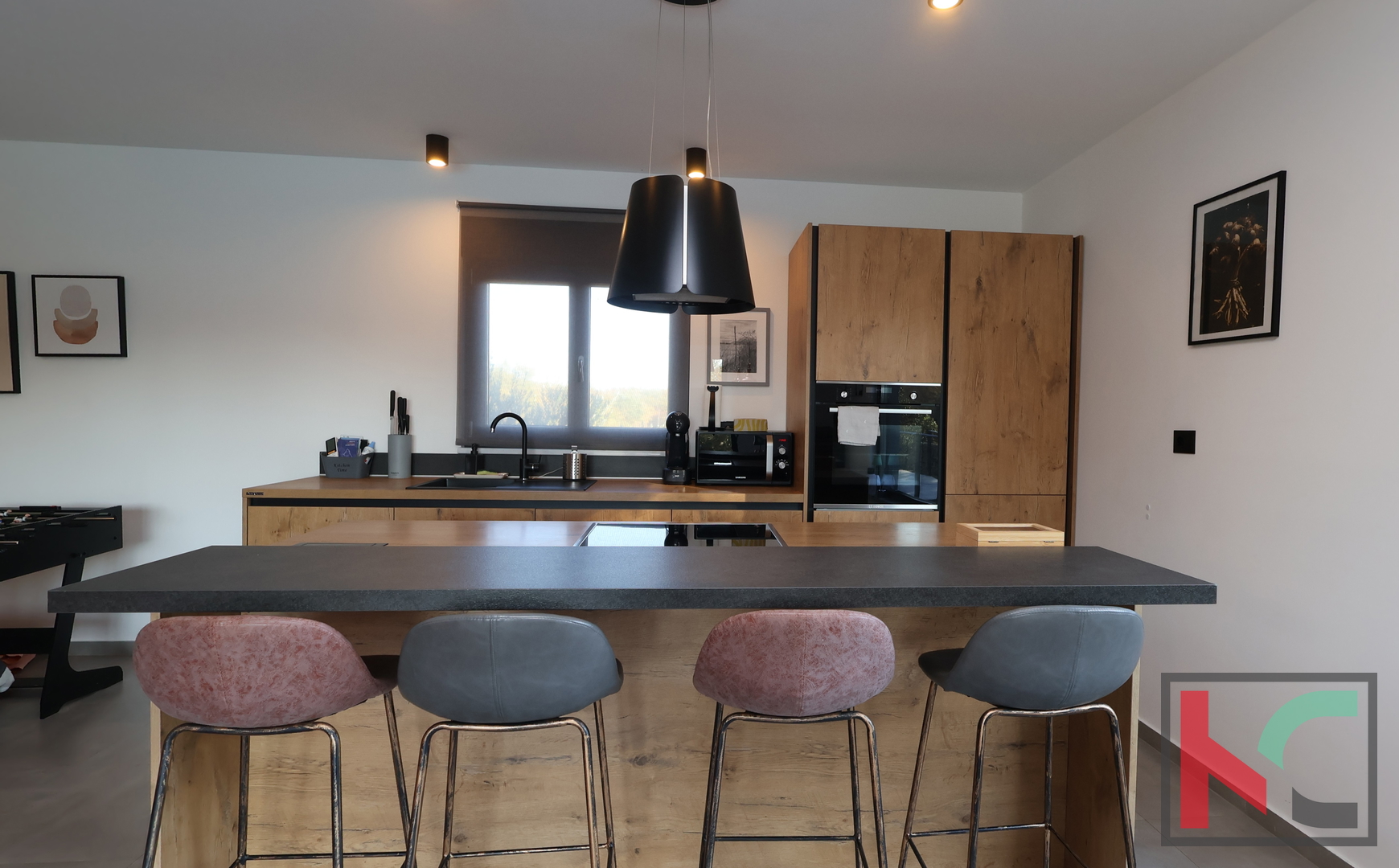 U malom selu Općine Barban, prodajemo prizemnicu s bazenom, montažne gradnje, izgrađenu 2022. godine. Nekretnina se sastoji od 119 m2 netto stambenog prostora te se nalazi na okućnici ukupne kvadrature 814 m2.Sastoji se od hodnika iz kojeg ulazimo u tri spavaće sobe, gostinjski toalet, ostavu i i veliki open space prostor sa kuhinjom, blagovaonom i dnevnim boravkom. Svaka spavaća soba ima vlastitu kupaonicu, u kojima se nalazi podno grijanje. Dvije spavaće sobe imaju izlaz na grijani bazen od 29m2 i natkrivenu terasu. U dnevnom se boravku nalazi kamin i infracrvena sauna te veliki prozor sa pogledom na prirodu i zelenilo.