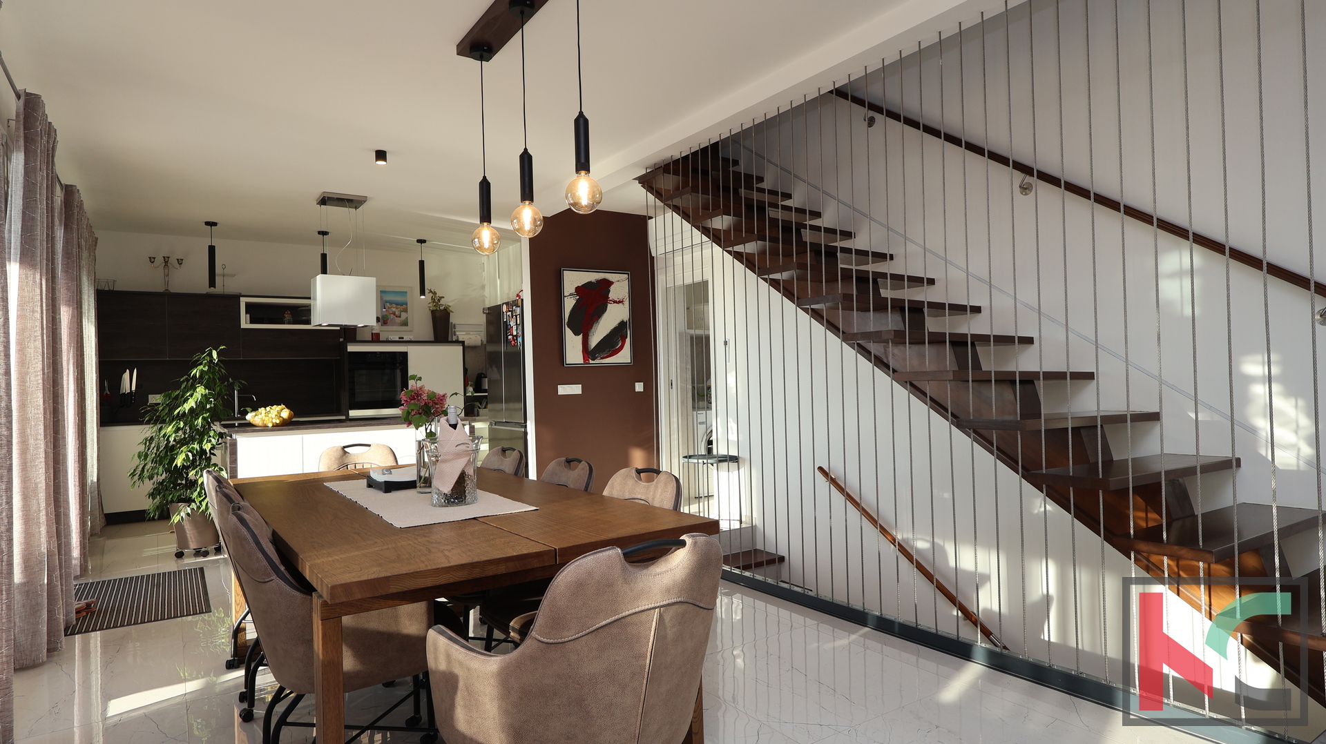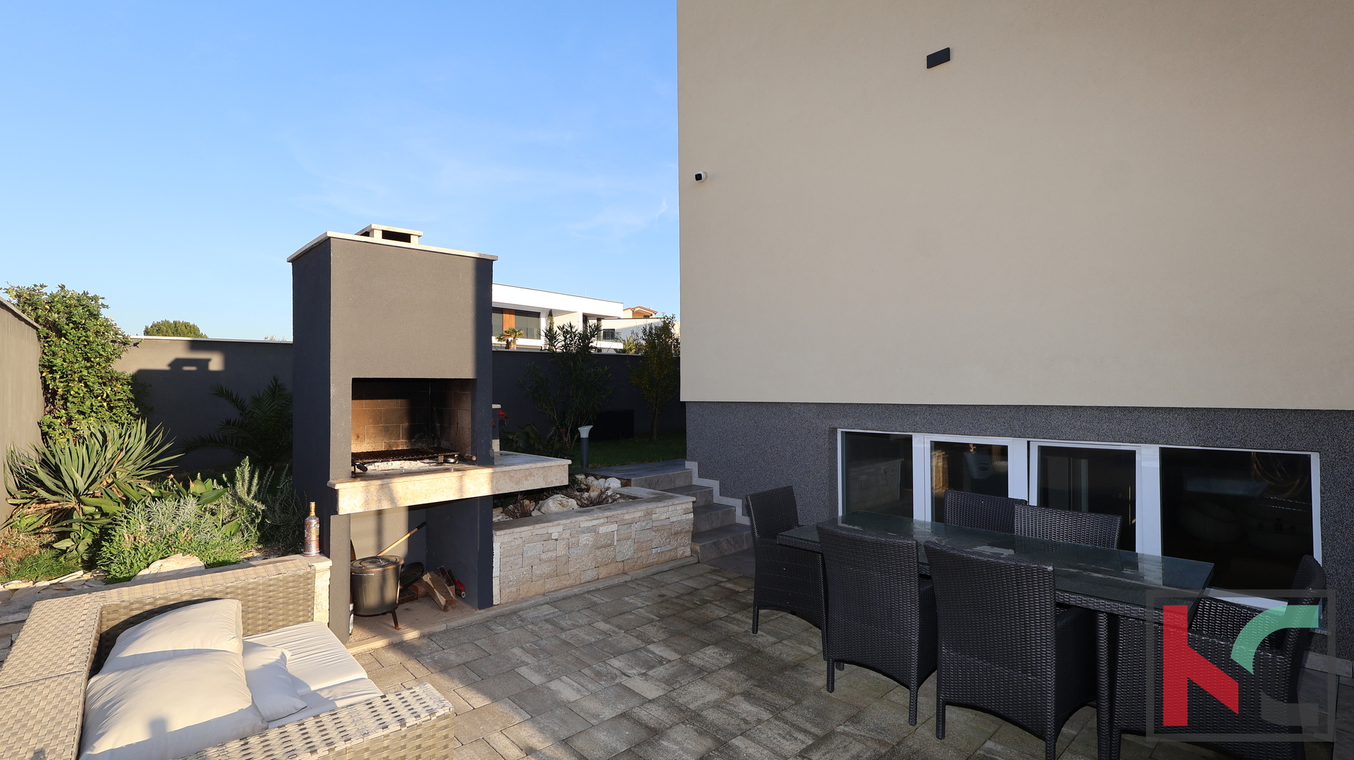 Na uređenoj i ugodno osmišljenoj okućnici nalazi se natkrivena terasa, roštilj, sunčalište, padajući bazen te parkirna mjesta.