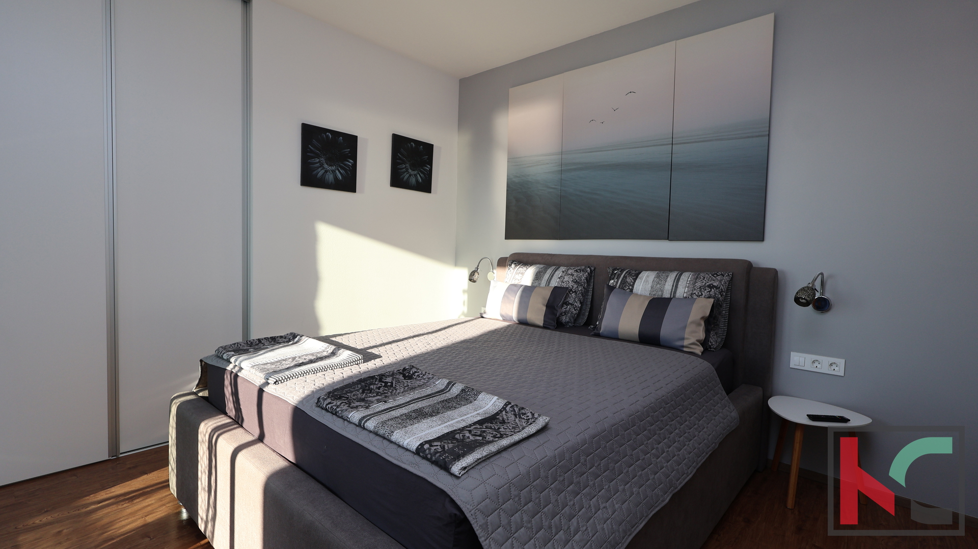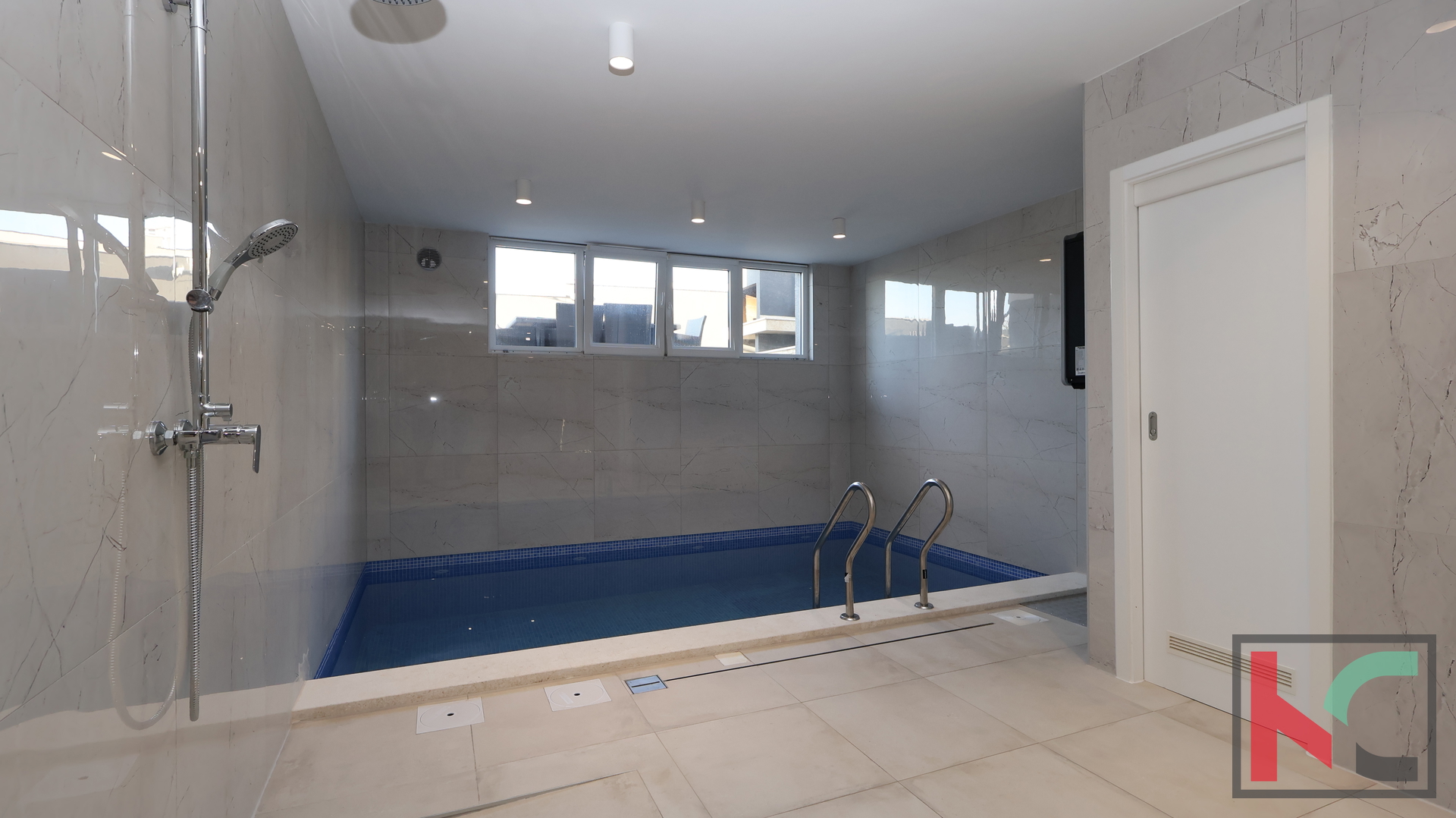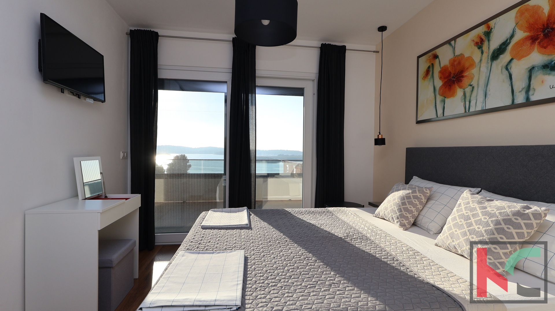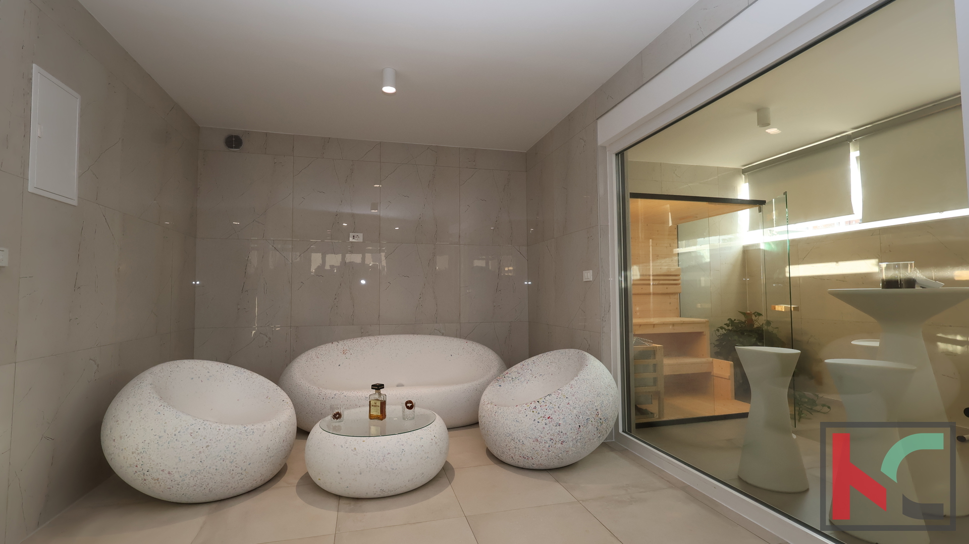 Unutranjim modernim drvenim stepenicama dolazimo na prvu etažu, gdje se nalaze tri spavaće sobe sa ugradbenim ormarima, od kojih svaka ima izlaz na zajedničku terasu sa prekrasnim pogledom na more te svakoj sobi pripada vlastita kupaonica. Dodatni luksuz ovoj nekretnini, daje i Spa zona koja se nalazi u podrumu zgrade, povezana unutarnjim stepenicama sa gornjim etažama, a sadrži bazen i saunu, prostor za odmor, pa time ovo mjesto čini savršeno za opuštanje i mir.