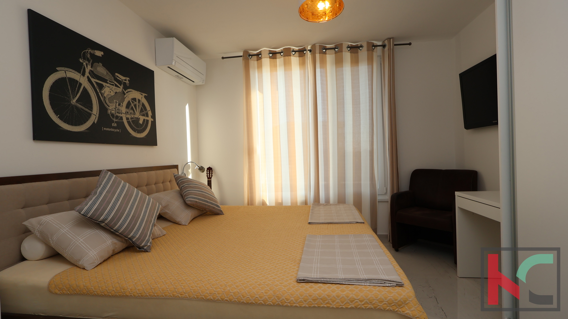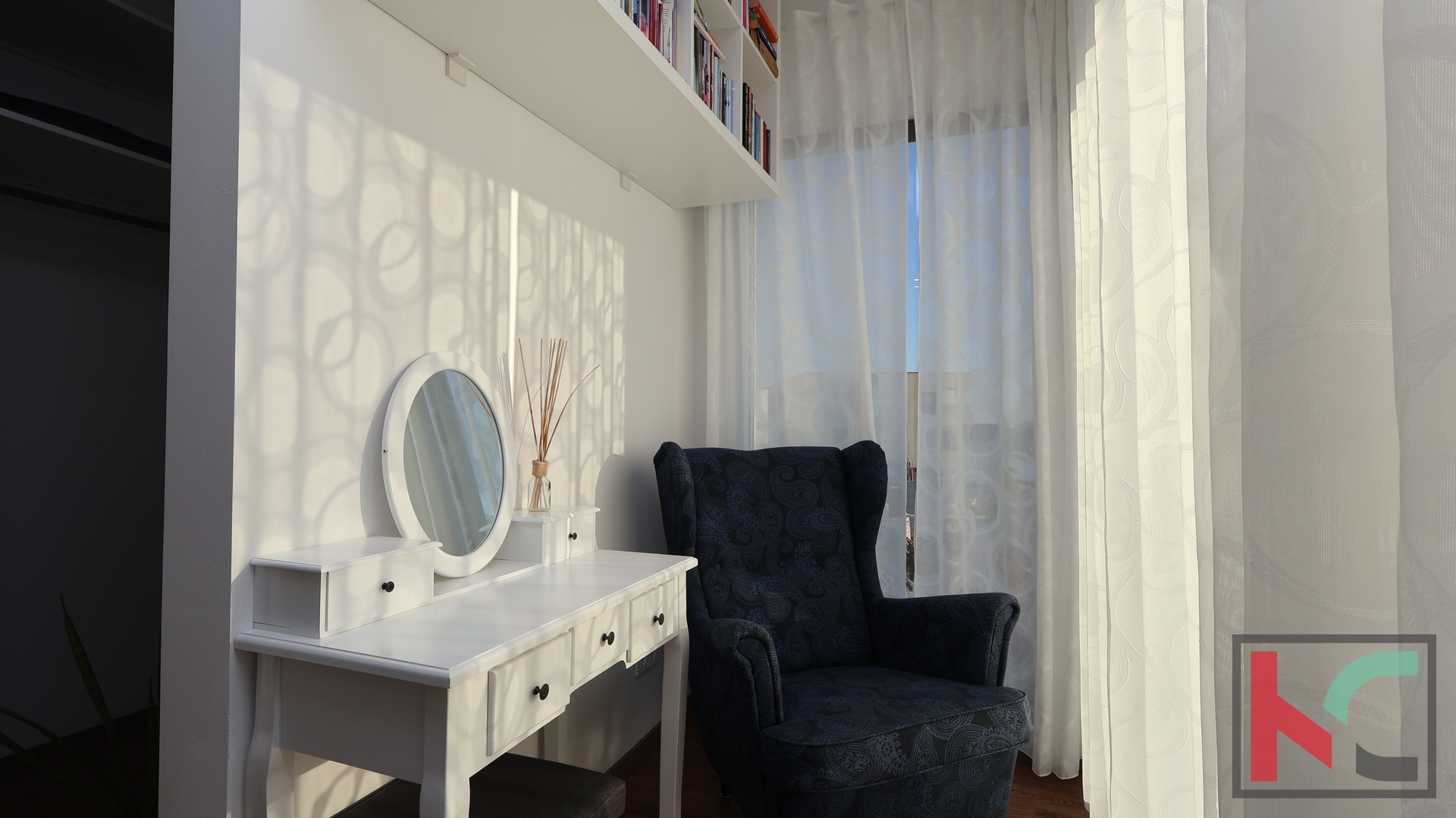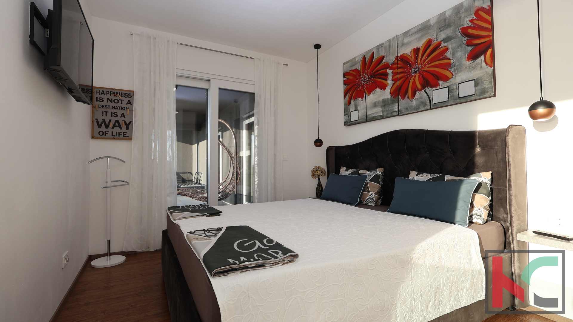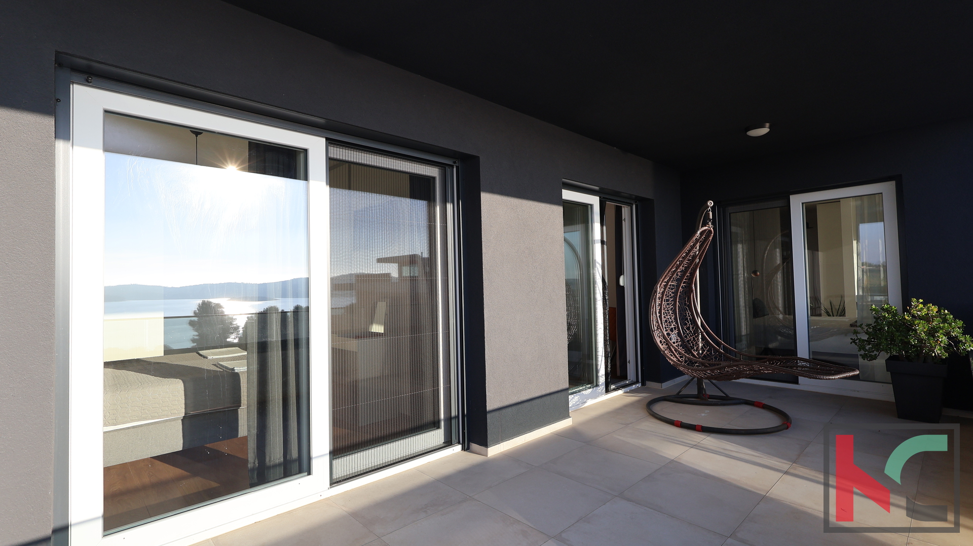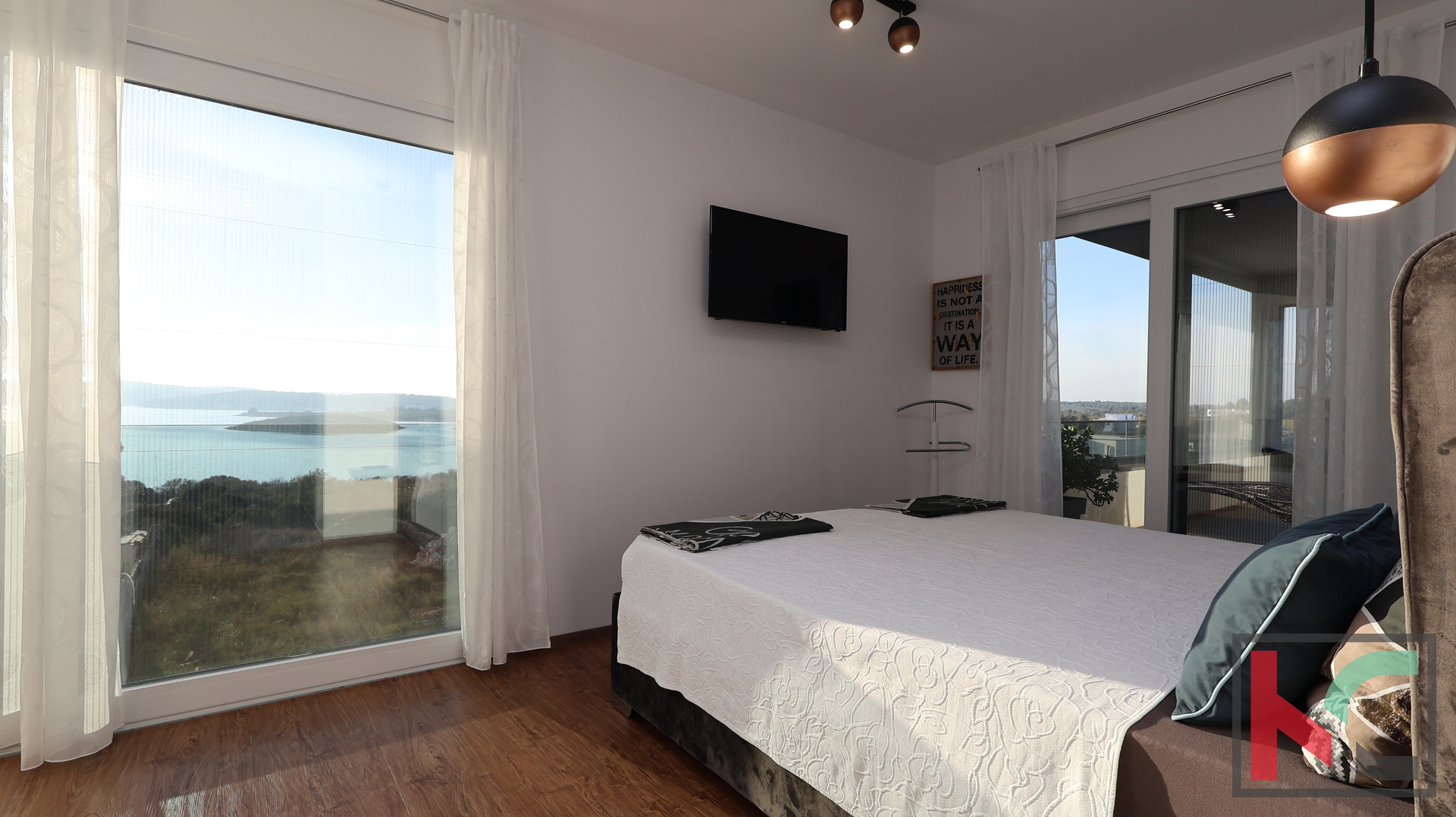 Unutranjim modernim drvenim stepenicama dolazimo na prvu etažu, gdje se nalaze tri spavaće sobe sa ugradbenim ormarima, od kojih svaka ima izlaz na zajedničku terasu sa prekrasnim pogledom na more te svakoj sobi pripada vlastita kupaonica. Dodatni luksuz ovoj nekretnini, daje i Spa zona koja se nalazi u podrumu zgrade, povezana unutarnjim stepenicama sa gornjim etažama, a sadrži bazen i saunu, prostor za odmor, pa time ovo mjesto čini savršeno za opuštanje i mir.
