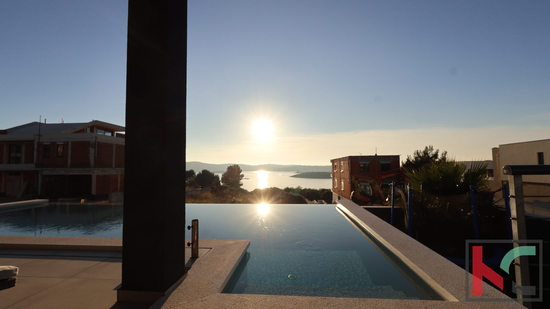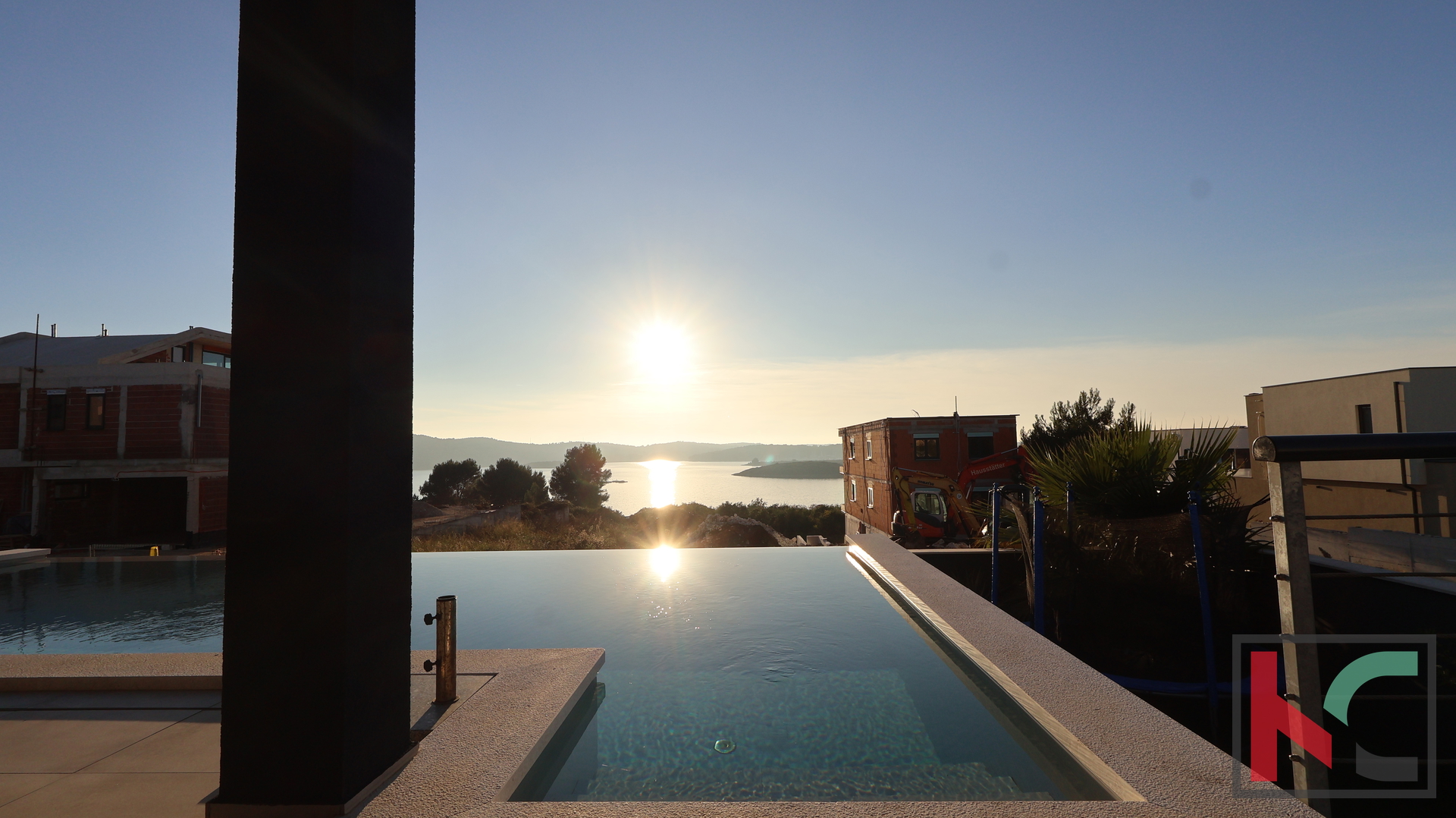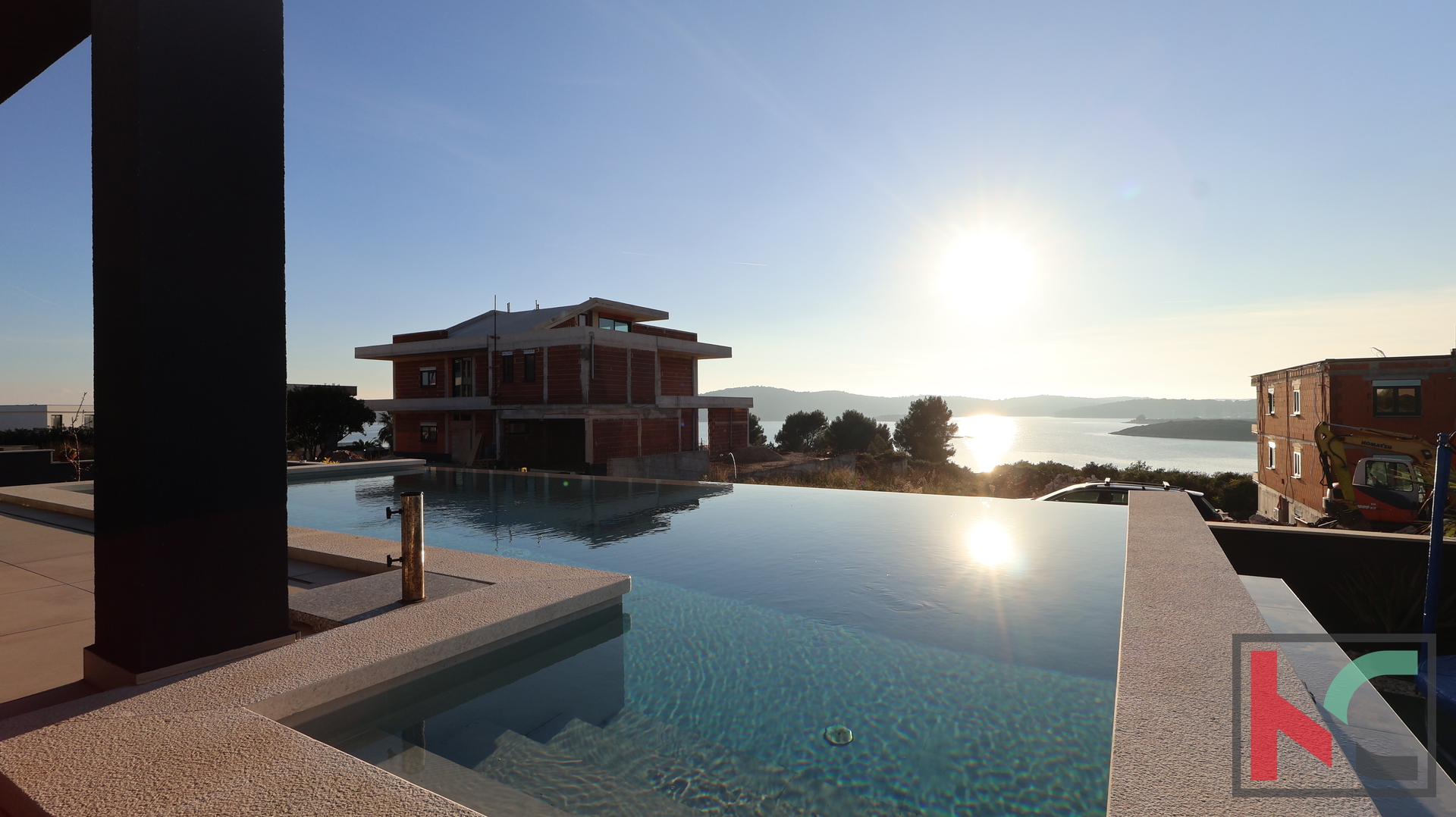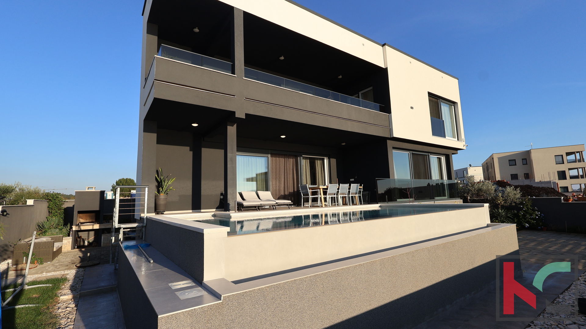 Prodajemo luksuznu vilu sa otvorenim pogledom na more te unutarnjim i vanjskim bazenom, smještenu na parceli od 450m2. Kuća je ukupne stambene površine od 240m2 te se proteže na podrum, prizemlje i prvi kat. U prizemlju se nalazi hodnik, otvoreni dnevni boravak sa kuhinjom i blagovaonom, ostava, spavaća soba sa vlastitom kupaonicom te dodatni wc. Prostor pruža veličanstven spoj zanimljivog dizajna, fukcionalnosti i modernizma. Velike staklene cijene daju nam puno svjetlosti i savršen pogled na more te izlaz na vanjski bazen i uređeno sunčalište.