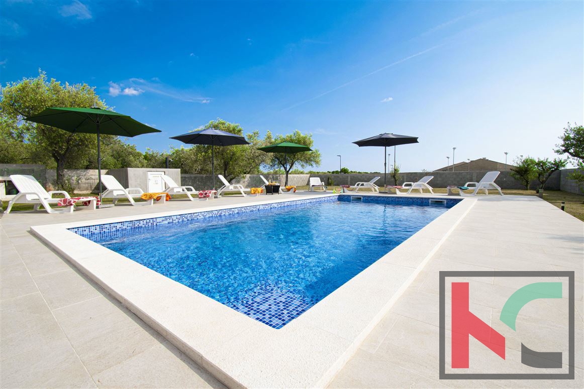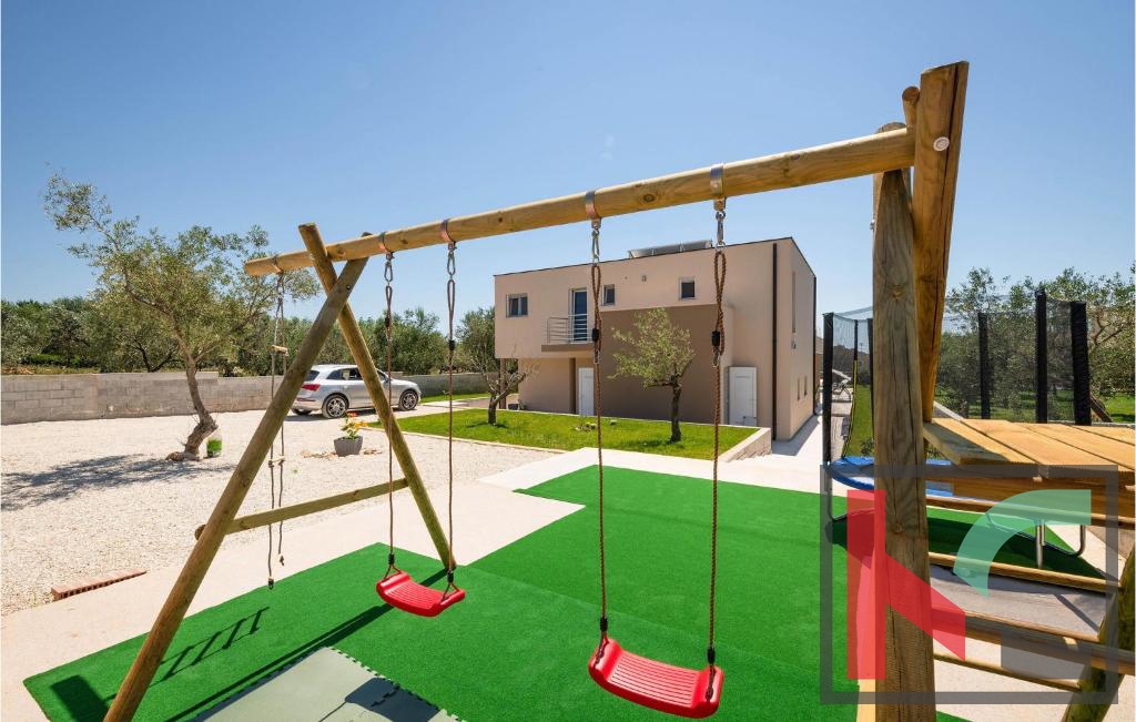 Uređena i ograđena okućnica uključuje bazen od 28 m2, sunčalište, roštilj zonu, dječje igralište i mediteranski vrt s maslinama.