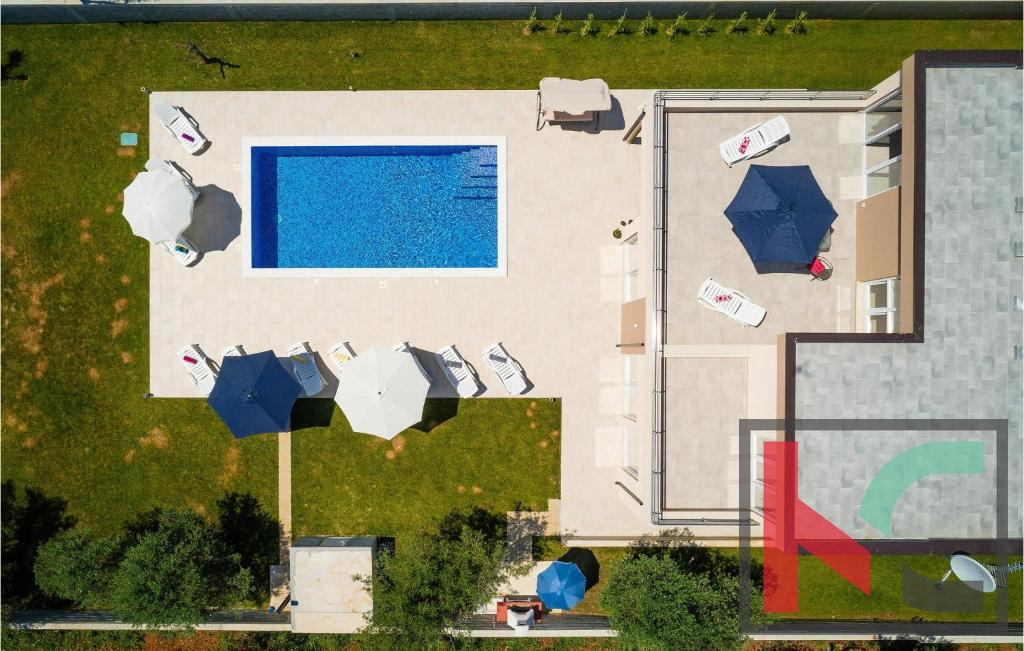 U mirnom dijelu Vodnjana u slijepoj ulici smještena je ova suvremena vila na parceli od 1.171 m2, s otvorenim pogledom na istarski krajolik, more i otočje Brijuna.