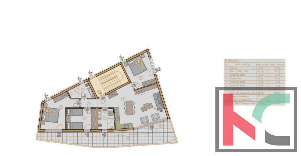 Raspored i sadržaj: ulazni hodni, prostrani dnevni boravak s kuhinjom i blagovaonicom, tri spavaće sobe, dvije moderno opremljene kupaonice s podnim grijanjem te velika terasa sa staklenom ogradom za potpuni doživljaj mediteranskog ambijenta
