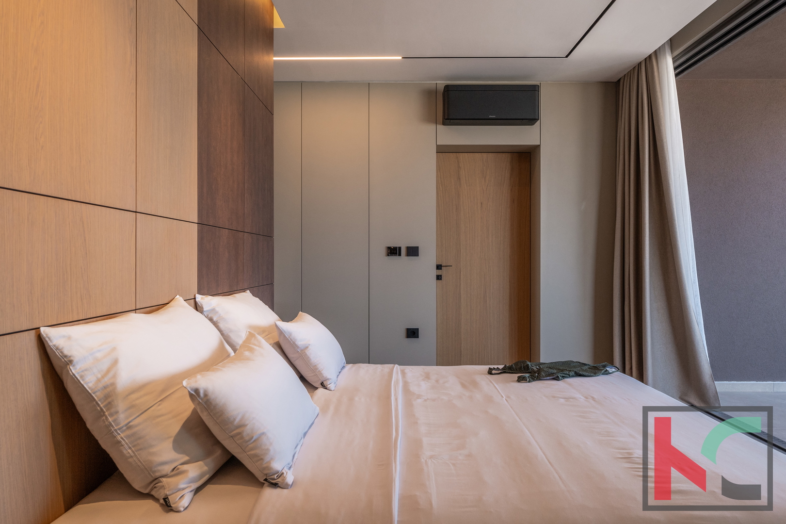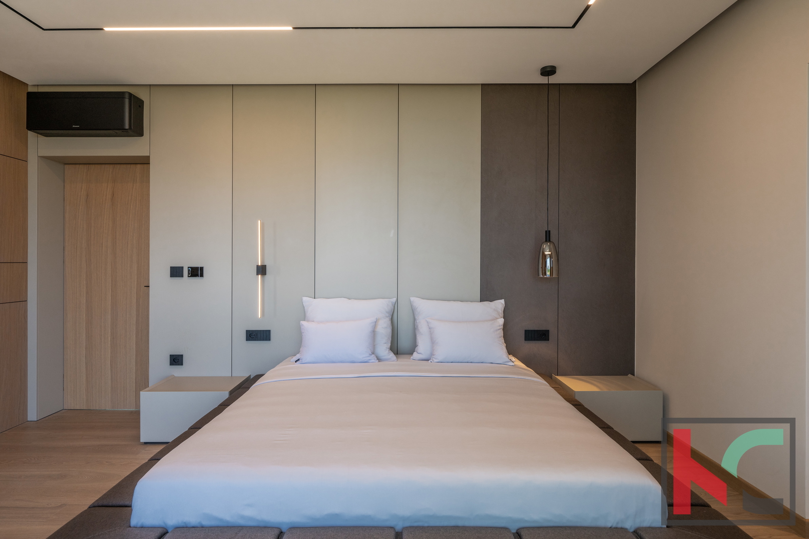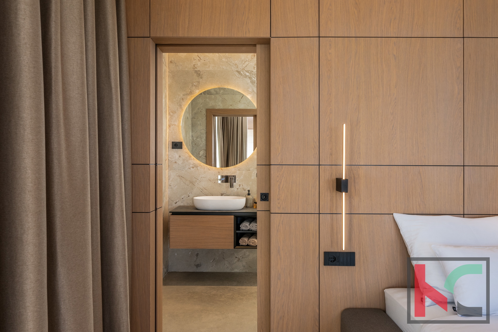 Na katu su smještene tri prostrane spavaće sobe, svaka s vlastitom kupaonicom i izlazom na natkrivenu terasu s otvorenim pogledom na more. Ovakav raspored osigurava maksimalnu udobnost i privatnost, bilo da se nekretnina koristi za obiteljski život ili kao luksuzna investicija za turistički najam.