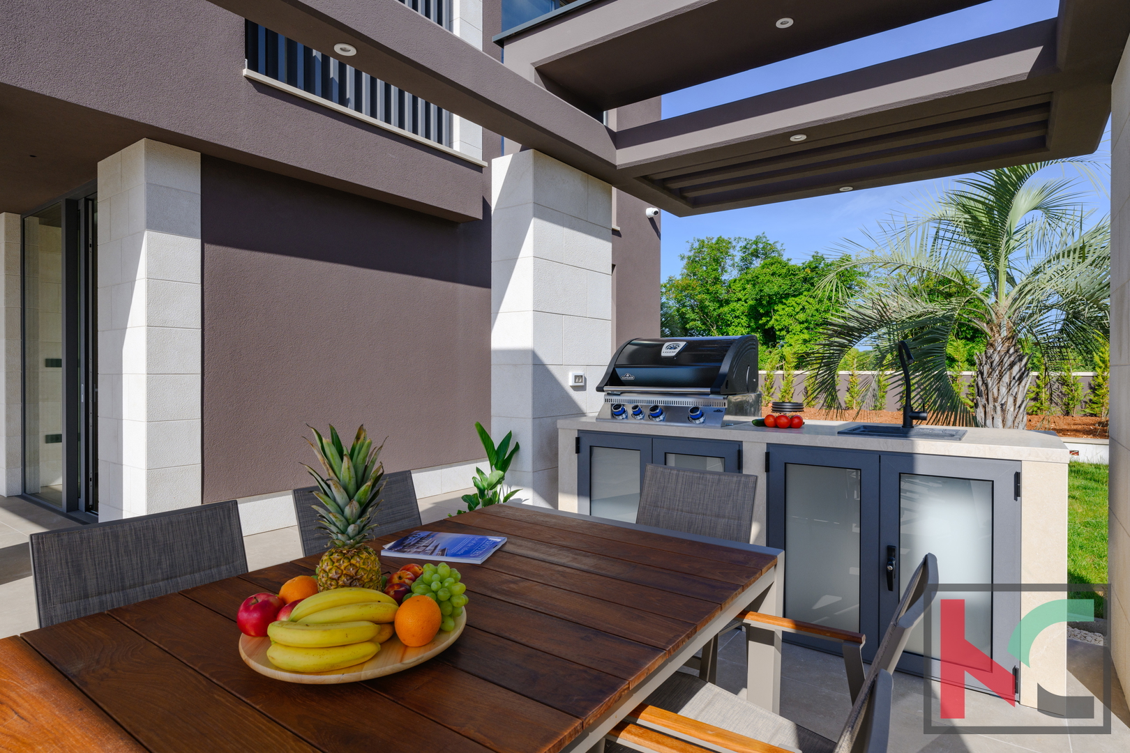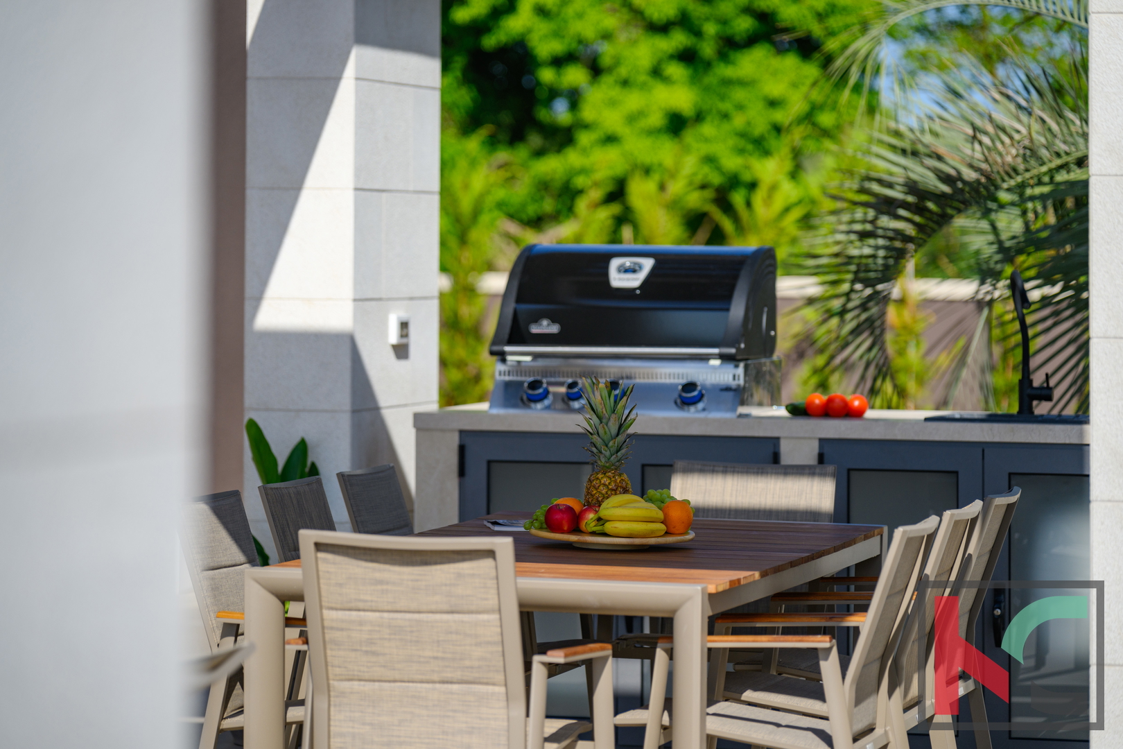 Vanjski prostor dodatno naglašava mediteranski stil života te uključuje uređeni vrt, natkrivenu blagovaonicu na otvorenom, vanjsku kuhinju s roštiljem te pomoćnu kućicu uz bazen. Posebnu praktičnost pruža natkriveno parkirno mjesto s punjačem za električno vozilo, uz dodatna parkirna mjesta unutar ograđenog posjeda – ukupno četiri.
