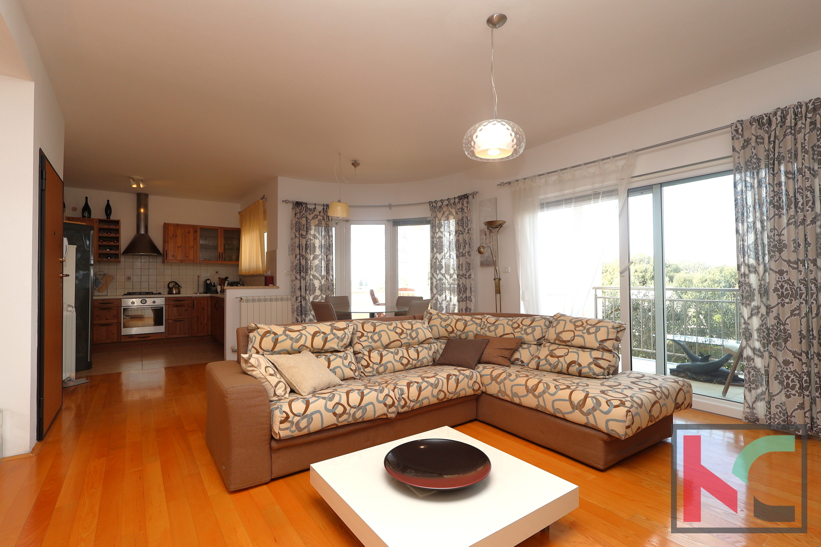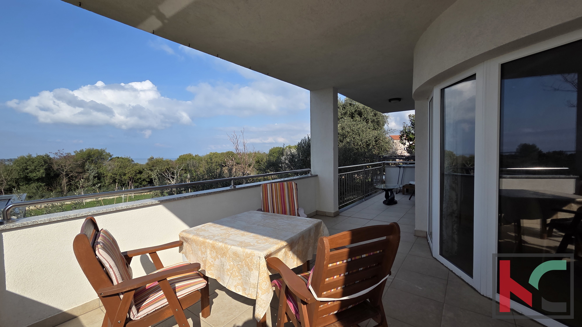 Velike staklene stijene ispunjavaju prostor prirodnim svjetlom i pružaju ugodan pogled na more i okolno zelenilo. Iz dnevnog boravka izlazi se na prostranu natkrivenu terasu – idealnu za jutarnju kavu, opuštanje tijekom dana ili večernja druženja uz zalazak sunca.
