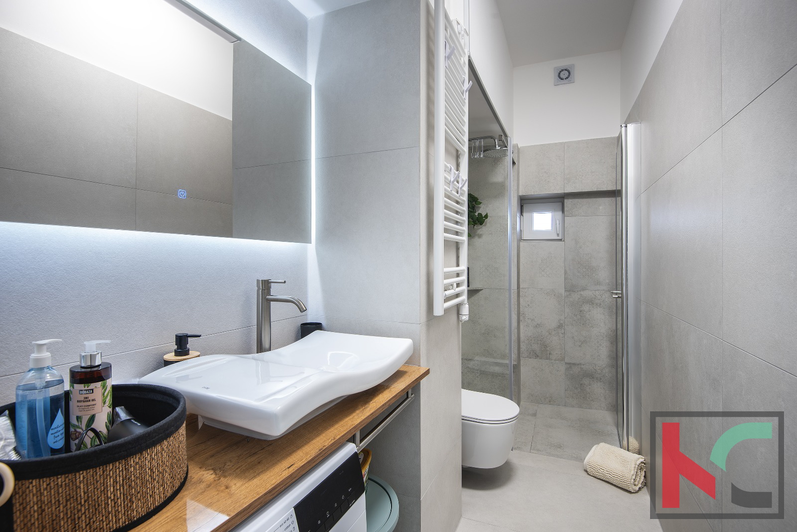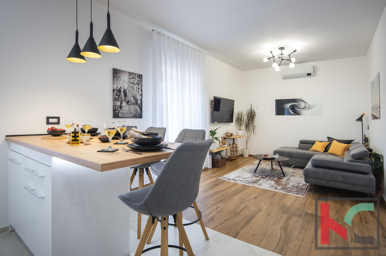 Gretje in hlajenje stanovanja je zagotovljeno s tremi klimatskimi napravami, v kopalnici pa je vgrajeno talno gretje.